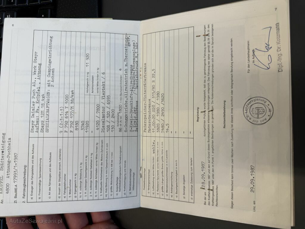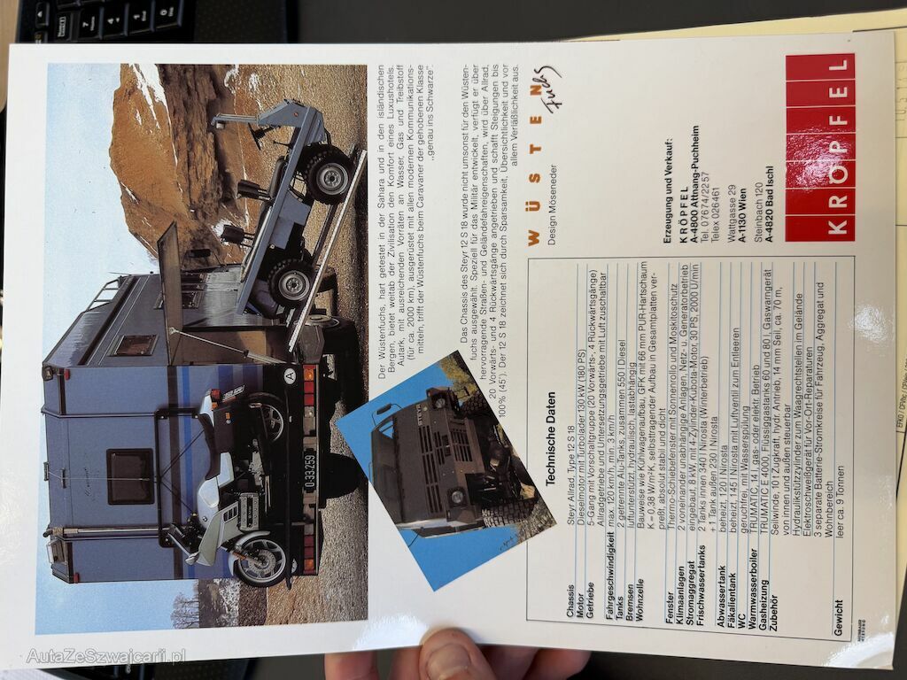 Dem Alter und Km entsprechende Gebrauchsspuren. Hydraulische Abstützung, Frontseilwinde, Keine Schweizer Zulassung, jedoch Formular 13.20A vorhanden. Österreichische Zulassung mit Dokumente. Damals sehr aufwändig gebautes Fahrzeug mit Dokumentation. (Haflinger nicht dabei). Fzg fährt. Verkauf im Kundenauftrag.