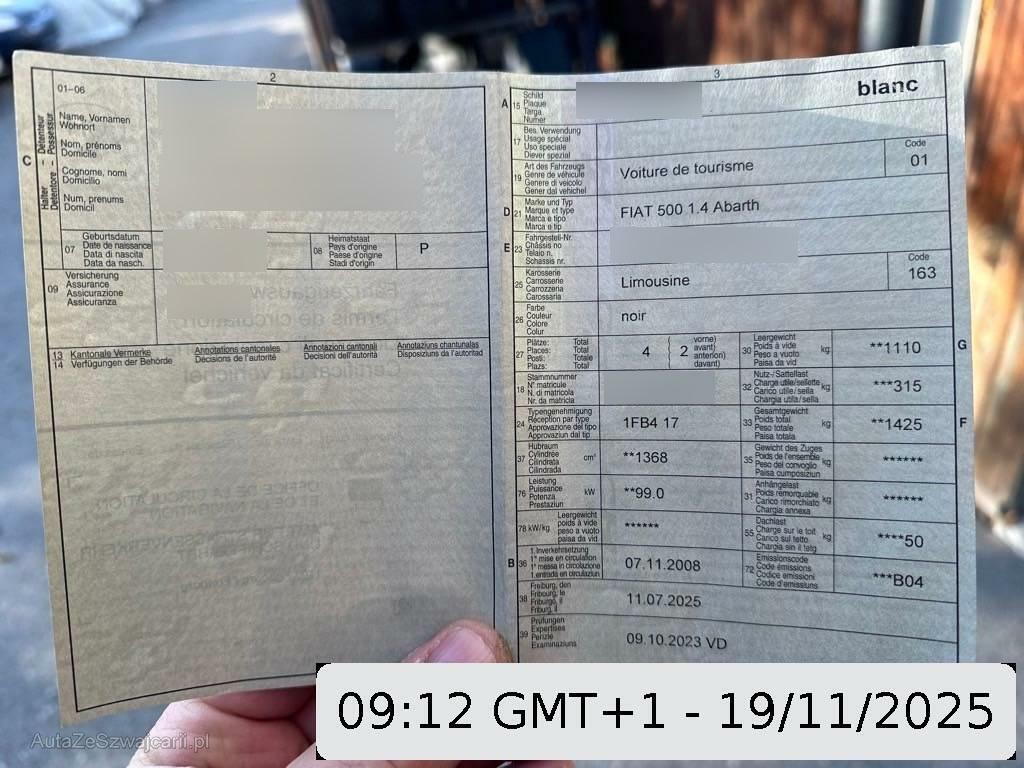 | Serienausstattung | Stossstangen und Aussenspiegel in Wagenfarbe, Tankdeckel abschliessbar, Servolenkung, ISOFIX Kindersitzvorrichtung, Blue&Me: Bluetooth, USB-/MP3-Anschluss, mit SMS Interpreter und Sprachsteuerung, Durchtauchschutz auf allen Sitzplätzen, Klimatisierungsautomatik, Beide Make up-Spiegel beleuchtet, Multifunktions-Sportlenkrad in Leder, Easy-Entry Lehnenentriegelung, Elektronisches Stabilitäts-Programm (ESP), Rücksitzlehne geteilt abklappbar, Kopfstützen hinten, Heckscheiben-Wisch-/Waschanlage, Licht: Drittes Bremslicht, Abgedunkelte Seiten- und Heckscheibe, Licht: Nebelscheinwerfer, Radio/CD-Player mit 6 LS und MP3, Tageskilometerzähler, Leichtmetallräder Abarth Sport zweifarbig mit 5 Speichen 17J, Zigarettenanzünder, Gurtstraffer vorne, Berganfahrhilfe (Hill Holder), Assist: Antriebsschlupfregelung (ASR), Assist: Bremsassistent (BAS), Türgriffe aussen verchromt, Wegfahrsperre elektronisch, Licht: Tagfahrlicht, Pollenfilter (Staubfilter), Lenkrad: Lenkrad höhenverstellbar, Licht: Nebelschlussleuchte, Getriebe: 5-Gang-Getriebe, Antiblockiersystem (ABS), Scheibenwischer vorne mit Intervall, Aussenspiegel rechts und links beheizbar und elektrisch verstellbar, Drehzahlmesser, Getönte Scheiben, Stoff-Ausstattung, Notbremslicht (EBS), Aussentemperaturanzeige, Airbag: Knie-Airbag für Fahrer, Rote Bremszangen (v//h), Heckscheibenheizung, Reifenreparatur-Set (Tire Fit), Sitze: Fahrersitz höhenverstellbar, Abblendlichtausschaltverzögerung 'Follow me home', Elektrische Fensterheber vorne, Airbag: Window-Kopfairbags, Katalysator geregelt, HiFi-Sound System mit Verstärker und Subwoofer, Pedalerie mit Aluminiumauflage, Bordcomputer, Sportsitze vorne, Airbag: Airbag Fahrer und Beifahrer inkl. Seitenairbags, Dachspoiler, Zentralverriegelung mit Fernbedienung |