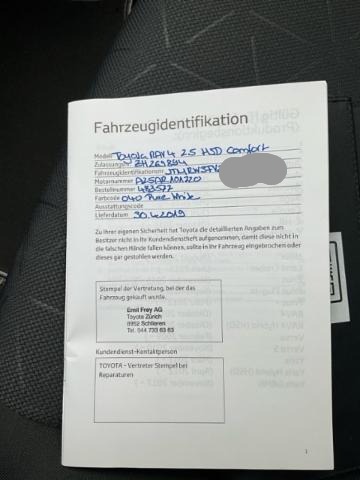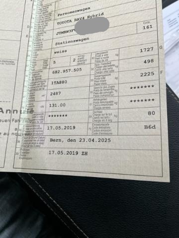 | Condition_and_Equipment | Zustand Batterie leer. Bereifung Fahrzeug wird mit Winterräder abgegeben. Kategorie Fahrzeug nach Diebstahl aufgefunden. Standzeit Das Fahrzeug wurde lange nicht gefahren Hochvoltfahrzeug Kein Ladekabel vorhanden Weitere wichtige Hinweise Das Fahrzeug wurde als Diebstahl von der Polizei aufgefunden und im Register wieder gelöscht. Die Batterie ist entladen, jedoch mit Überbrücken läuft das Fz einwandfrei. Zustand gut siehe Fotos. --- Weitere Beschädigungen kleine Delle in der Türe hinten links, siehe Fotos --- Serienaustattung Airbag Fahrer und Beifahrerseite Elektrische Fensterheber Nebelscheinwerfer Zentralverriegelung mit Fernbedienung Innenspiegel automatisch abblendbar Kopfairbag vorne und hinten Lederlenkrad mit Lederschaltknauf Scheibenwischer mit Regensensor Leichtmetallfelgen 17" Reifendruck-Kontrollsystem RDK Deaktivierung Beifahrerairbag Park-Distanz-Sensor vorne + hinten Aussenspiegel elektrisch verstellbar/ heizbar und anklappbar Audiofernbedienung am Lenkrad Rücksitzbank geteilt abklappbar 60/40 Seitenairbags vorne + hinten Stabilitätskontrolle VSC + Traktionskontrolle TRC Zwei Zonen-Klimaautomatik Rückfahrkamera Dachreling schwarz Follow-me-home Lichtfunktion Knieairbag Fahrer Isofix-Kindersitzbefestigung hinten Bluetooth-System Dämmerungs-Sensor HSA Berganfahrassistent Reifen-Reparatur Set LED-Scheinwerfer LED Tagfahrlicht ABS und EBD Elektr. Bremskraftverteilung inkl. BA Multi-Informationsdisplay USB-Anschluss LED Rückleuchten Totwinkel-Assistent Schaltwippen am Lenkrad Details siehe gültige Preisliste des Importeurs Keine Gewähr auf die Angaben der Serienausstattungen DAB+ Digital Audio Broadcast Anhänger-Stabilitätskontrolle Gratis-Service 6 Jahre/ 60'000 km Pack Safety Sense |