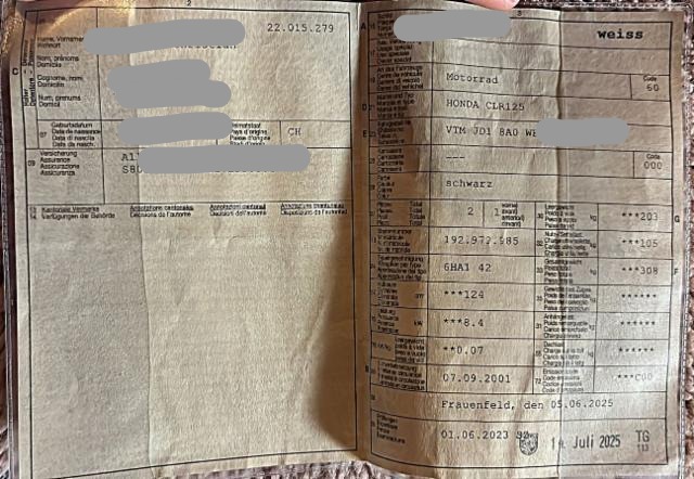 | Condition_and_Equipment | Zustand Fahrzeug ist fahrbar. Schlüssel Nur ein Schlüssel vorhanden. --- Links Linke Seite beschädigt. Rechts Rechte Seite beschädigt. Front Front rechts eingedrückt. Heck Heck rechts eingedrückt. Abgasanlage deformiert. Sonstige Schäden Div.Carrosserie Teile sind leicht beschädigt. Weitere Beschädigungen Schaden, Ausstattung und Zustand gemäss Bilder !!! Risiko Rahmen, Lenker!! |