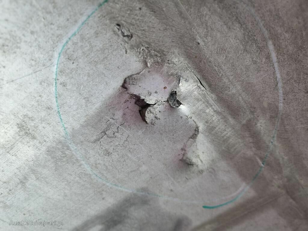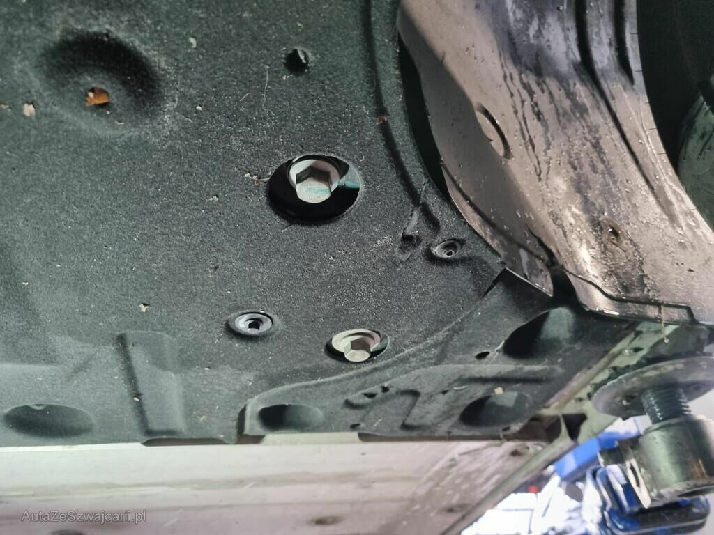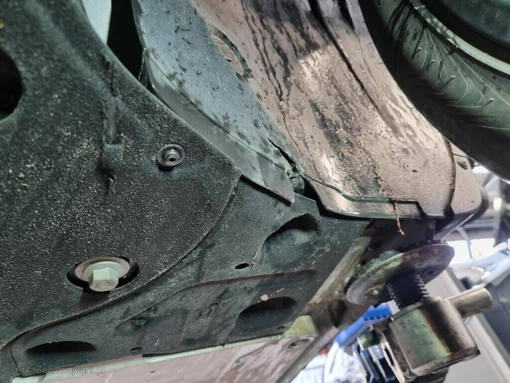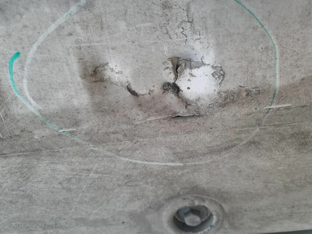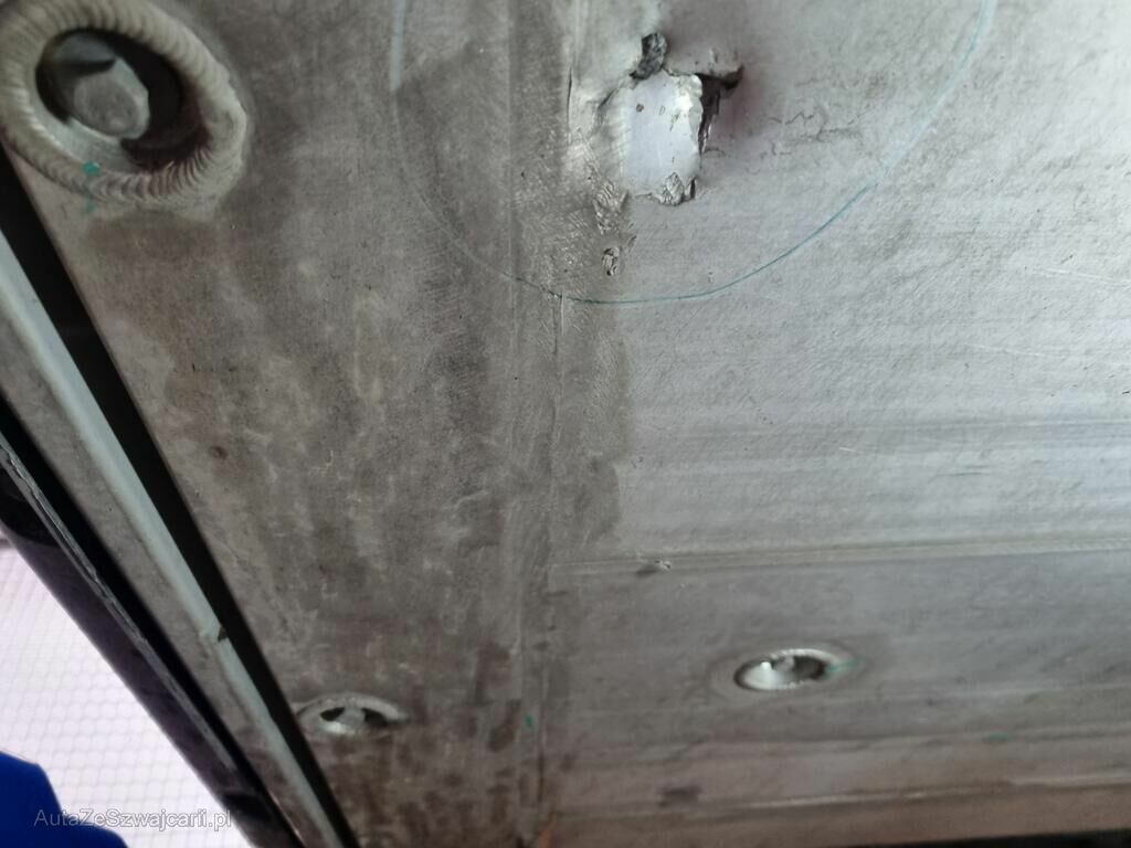 Carter batterie HT percé, protection carter inférieur déchirée, pare-boue avant gauche cassé.