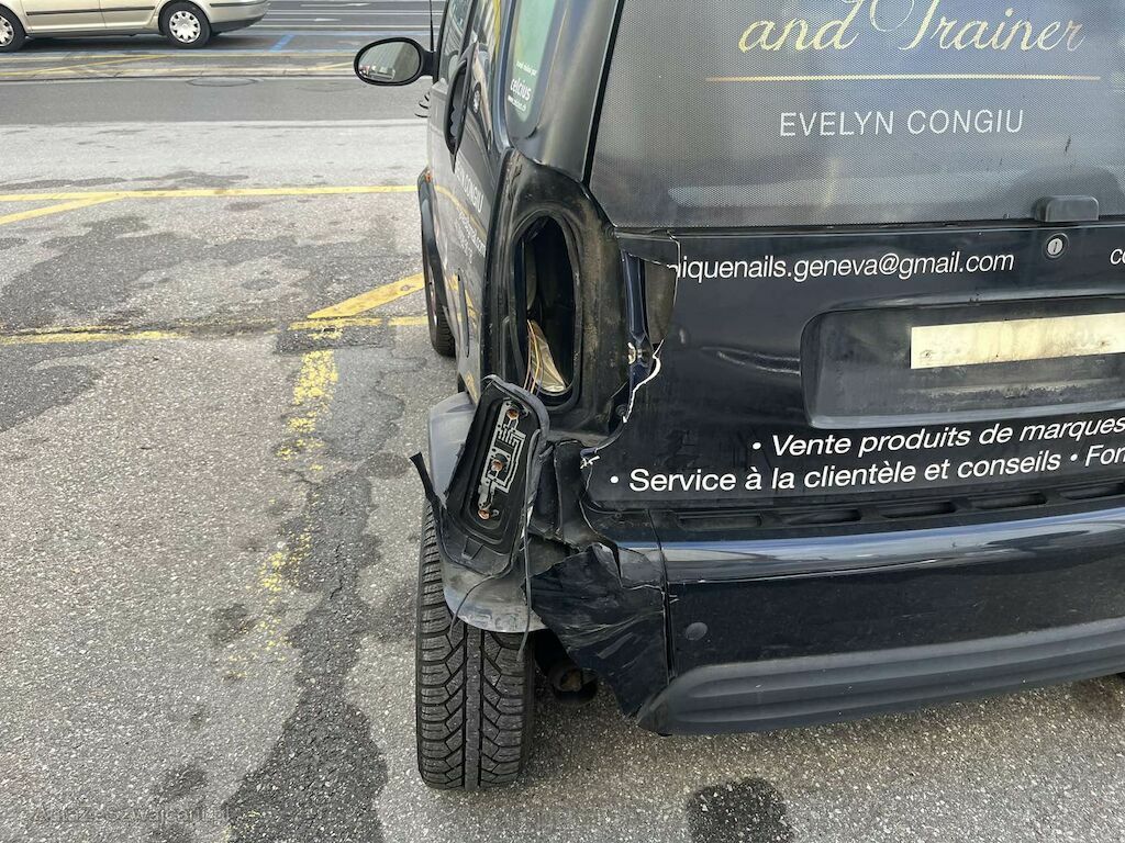 Pare-chocs arrière, aile arrière gauche, hayon, feux arrière gauche endommagés et cassés.