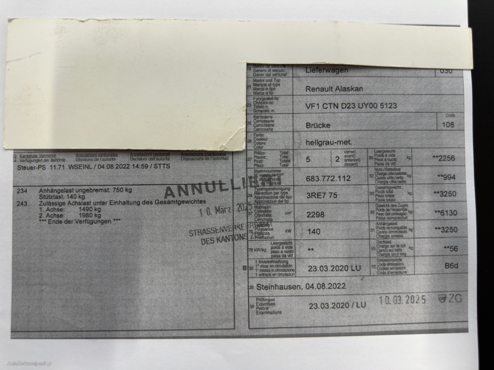 | Kommentar | Zustand gemäss Bilder. 2 Dellen auf Motorhaube Anhängerkupplung 3'250kg Diff. Sperre hinten Kunststoffwanne Rollabdeckung Für sichtbare oder nicht sichtbare Mängel wird nicht gehaftet. Wir haben am Fahrzeug nicht alles kontrolliert und alle Funktionen getestet. Das Risiko liegt somit vollumfänglich beim Käufer. Nachdem der Höchstbietende den Zuschlag erhalten hat, gibt es keine Nachverhandlung, auch wenn nicht deklarierte Mängel zum Vorschein kommen sollten. Ab Platz ohne Garantie, Wandelung und Minderung werden wegbedungen. Das Fahrzeug muss nach Gebots Ende innert 5 Arbeitstagen abgeholt werden. Es werden Standgebühren ab dem 6 Arbeitstag von Fr. 10.-- pro Tag verrechnet. |