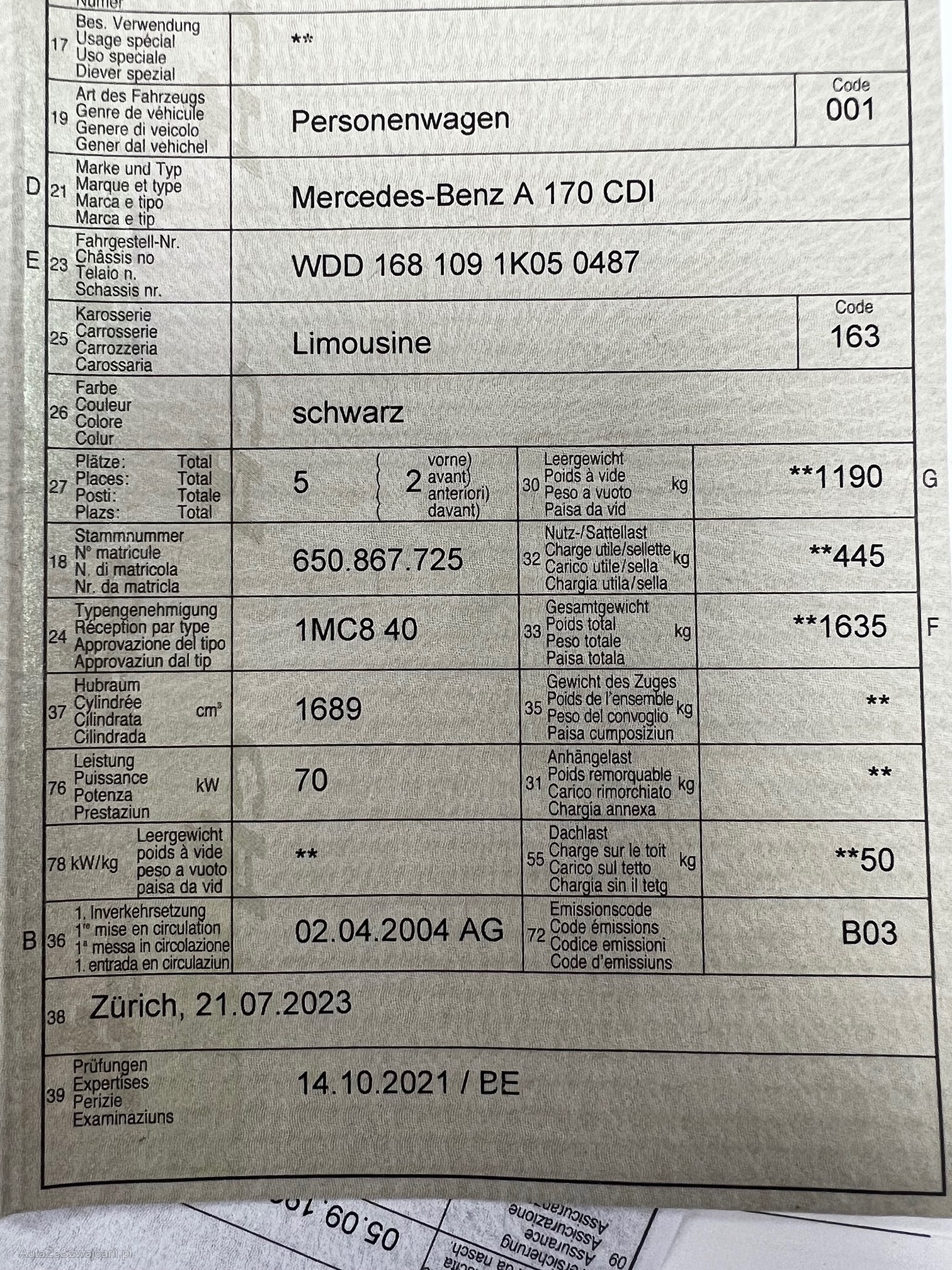 | Kommentar | Wischer Motor hinten fehlt, AGR Ventil ist zum ersetzen( sporadische Fehler im Eigendiagnose) |