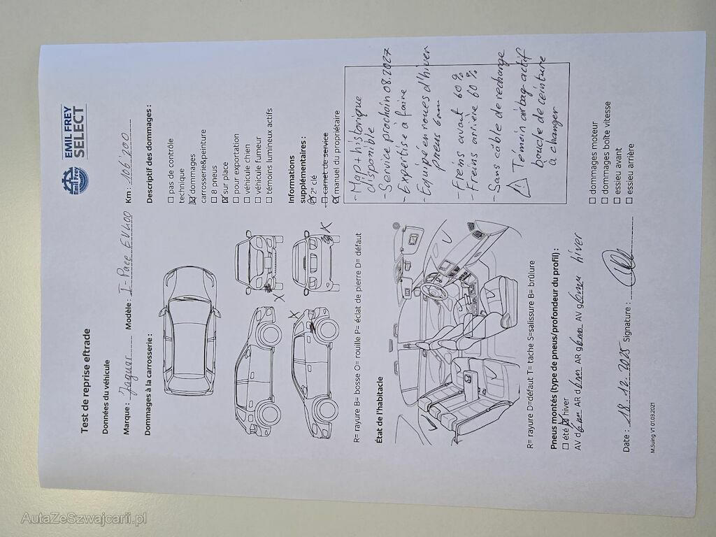 | Information | 2 clés Map + historique des services disponible Service prochain 08.2027 Expertise à faire Equipé en roues d'hiver pneus 6 mm Freins avant 60 % Freins arrière 60 % Rayures et bosses sur la carrosserie Cable de recharge pas disponible Témoin air-bag actif = boucle de ceinture à changer |