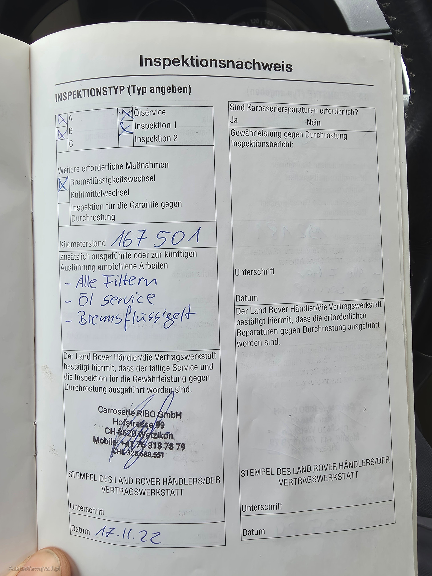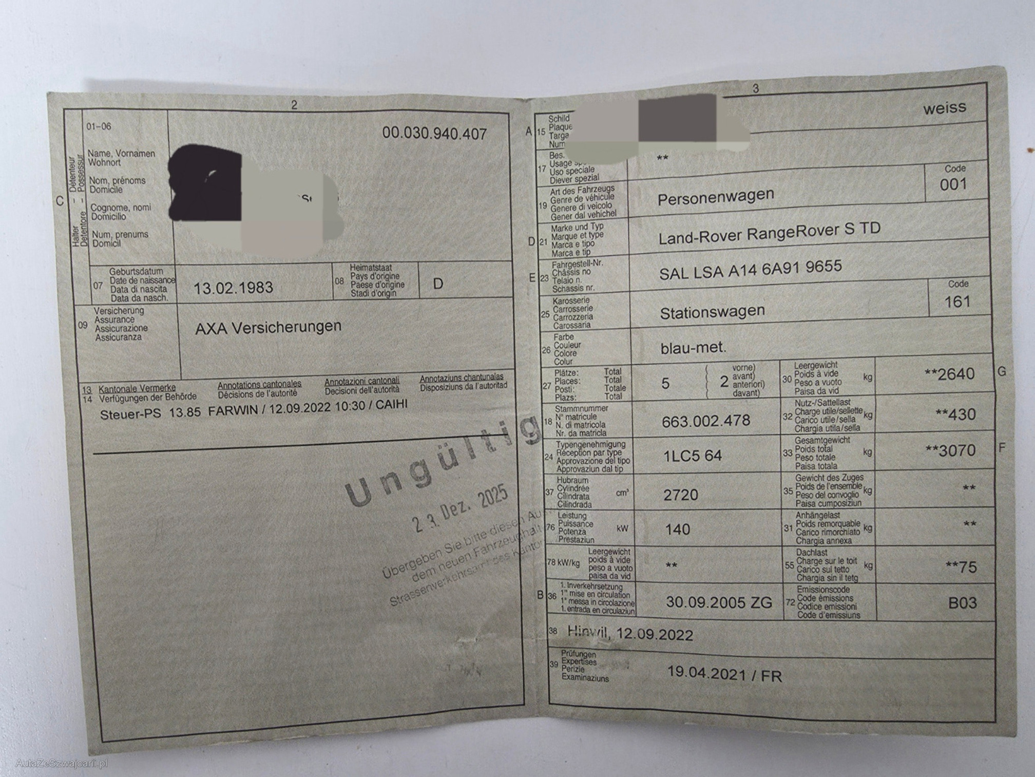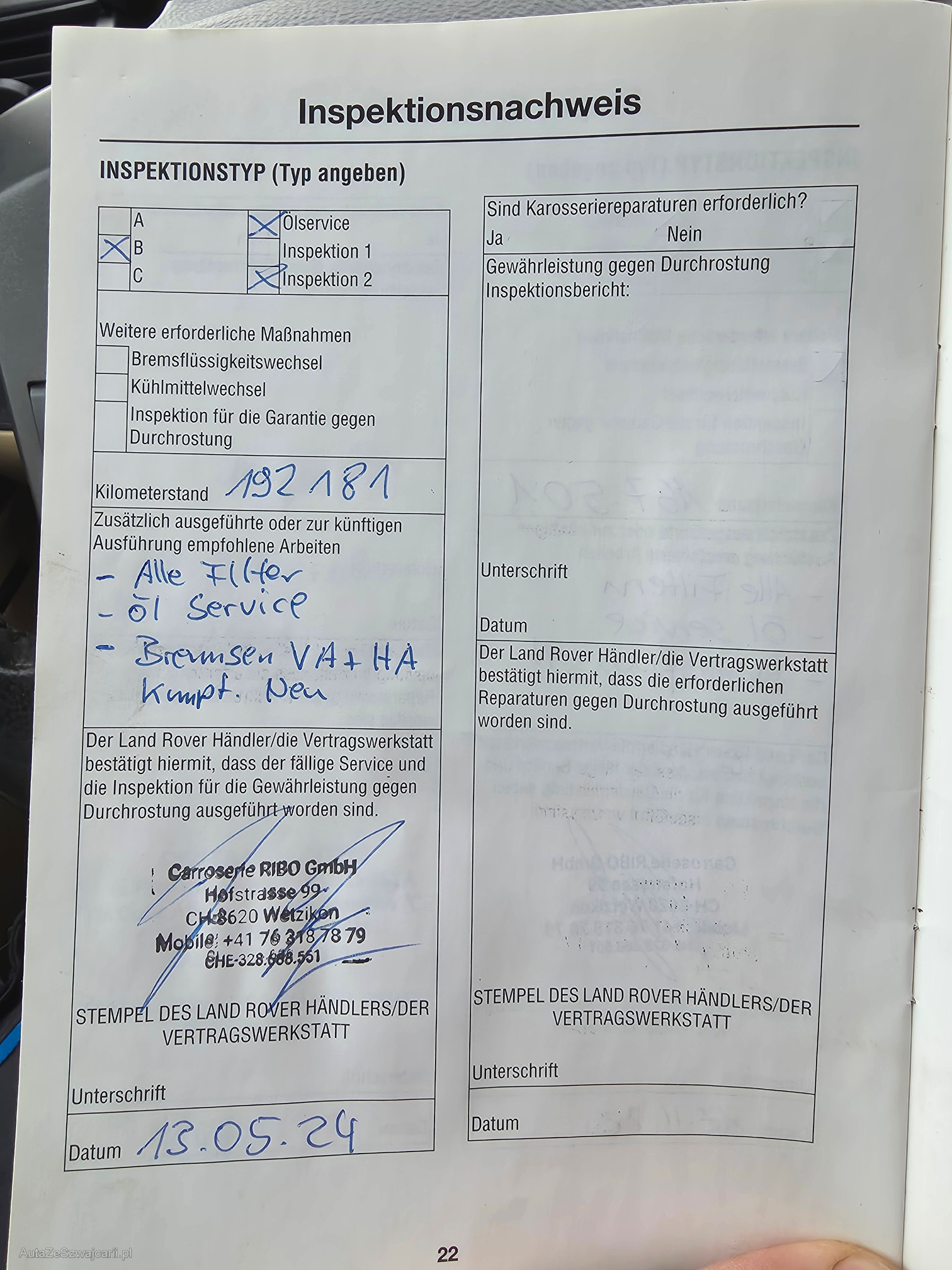 | Kommentar | Frisch ab Service. !!22" Felgen werden erst ab 4`000.- mitgegeben!! Gutachten vorhanden (siehe Foto). Fahrzeug hat 2 Originale Radsätze dazu. Fahrzeug ist Foliert, Originalfarbe Blau Met. Zahnriemen wurde im letzten Service ersetzt bei 221480Km im Dezember 2025! Es wurde kein Werkstattest gemacht. Preisverhandlungen vor Ort werden nicht akzeptiert. Fahrzeug fährt, Schaltet i.O. Ambiente Beleuchtung nachgerüstet. Displays in Kopfstützen funktionieren. Bremsen hinten Eisen auf Eisen (Abholung ohne Hänger auf eigenes Risiko). Kaltstart benötigt einige Startversuche, nach dem ersten Anlaufen startet der Motor problemlos. Das Fahrzeug muss inert 3 Tagen nach Auktionsende abgeholt und Bar bezahlt werden. |