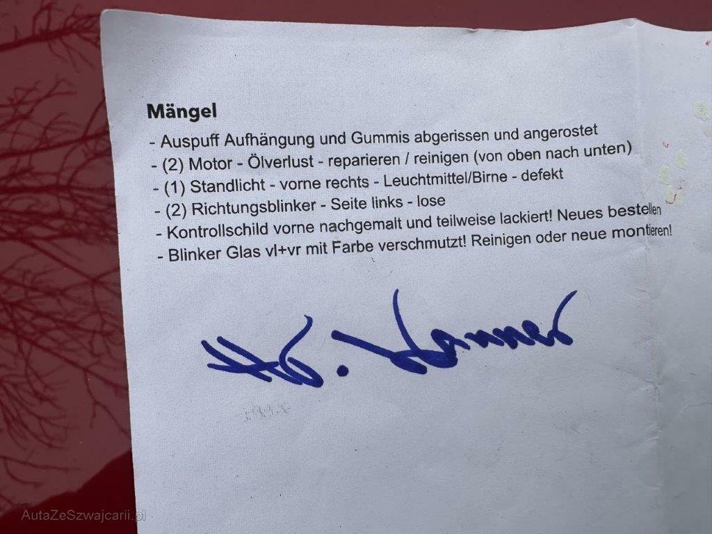 | Schadensbeschreibung | Anprall vorne. Dabei wurde die Stossstange beschädigt. Viele Vorschäden rundum. Mängel MFK gemäss Liste! 1 Schlüssel leicht verhagelt. |