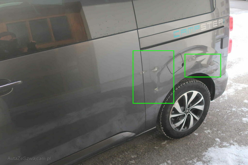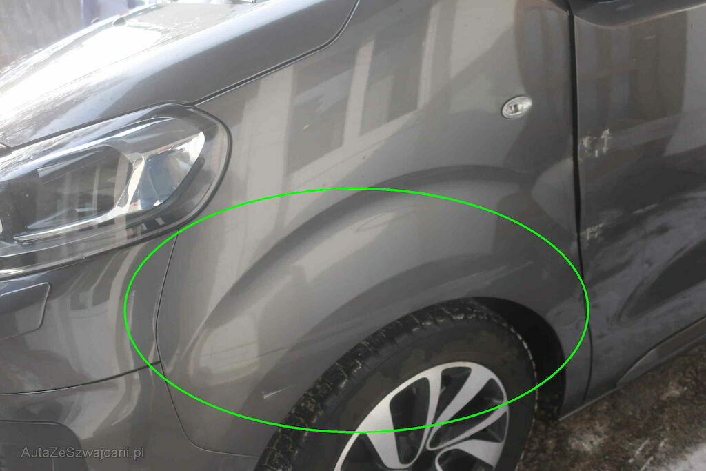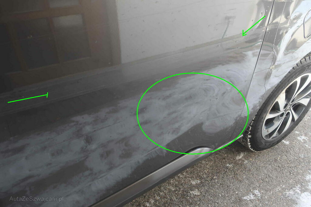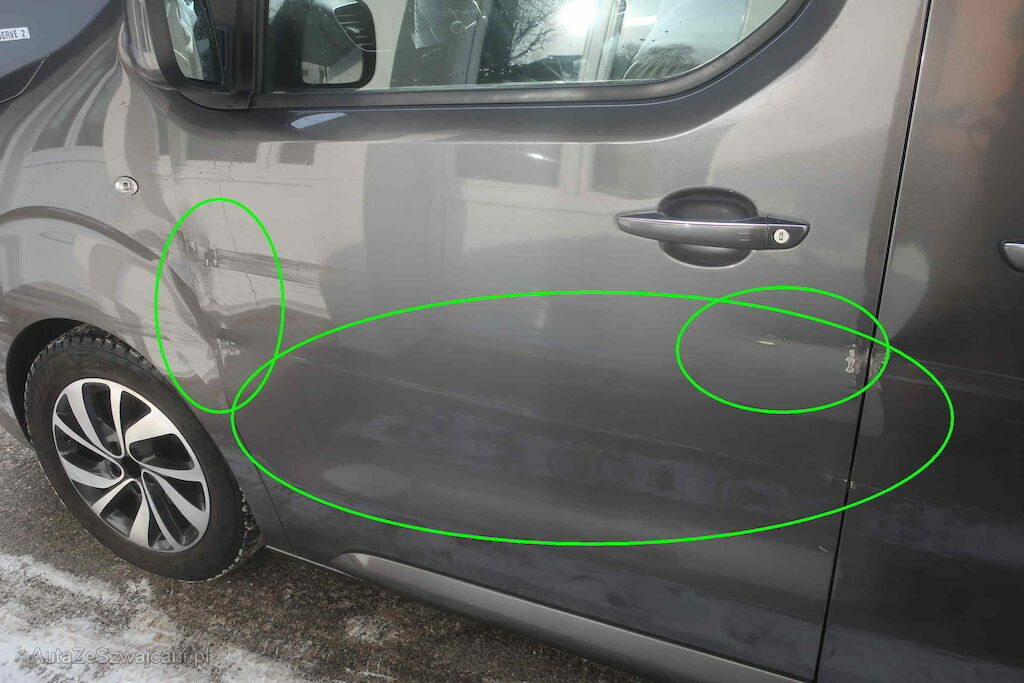 Flanc gauche.Aile et porte avant gauche déformé er rayé. Enfoncement porte latérale gauche, rayures et enfoncement aile arrière gauche.