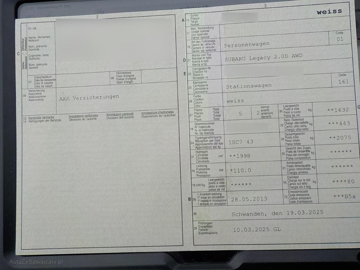 | Fahrzeugausweis | Vorhanden |