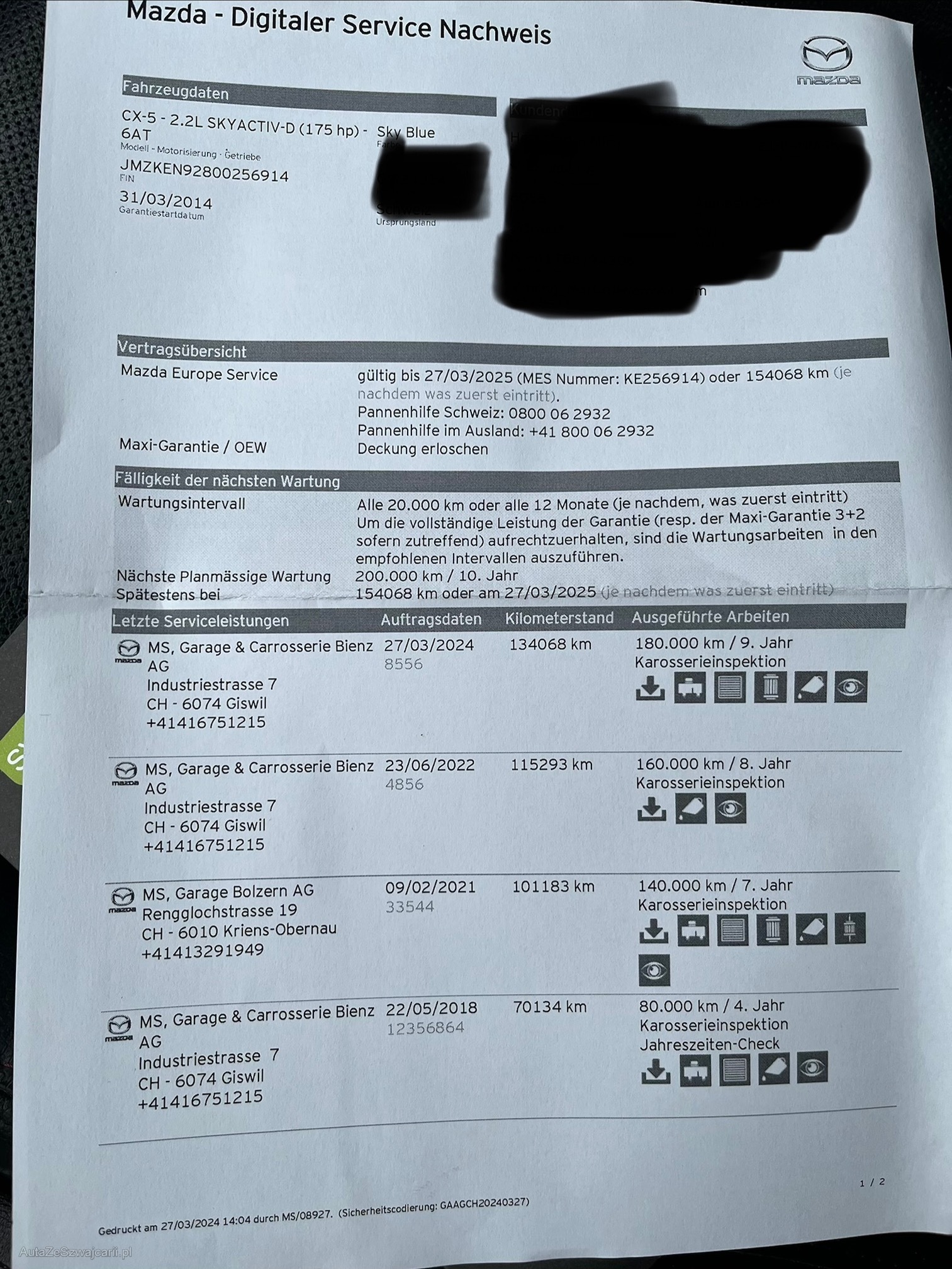 | Kommentar | Ab Platz ohne Garantie, Fahrzeug in einem sehr guten Zustand Motor hat Wasserverbrauch CO Test gab an, vermutlich Zylinderkopfdichtung Traggelenk vorne links spiel Rückspiegeleinklappung/Verstellung funktionslos Am 8.2025/Km 151'797: Injektorendichtungen ers. Verkockungen gesäubert, Ölwanne und Ausgleichswellen aus-/einbauen, Ansaugsieb ers. |