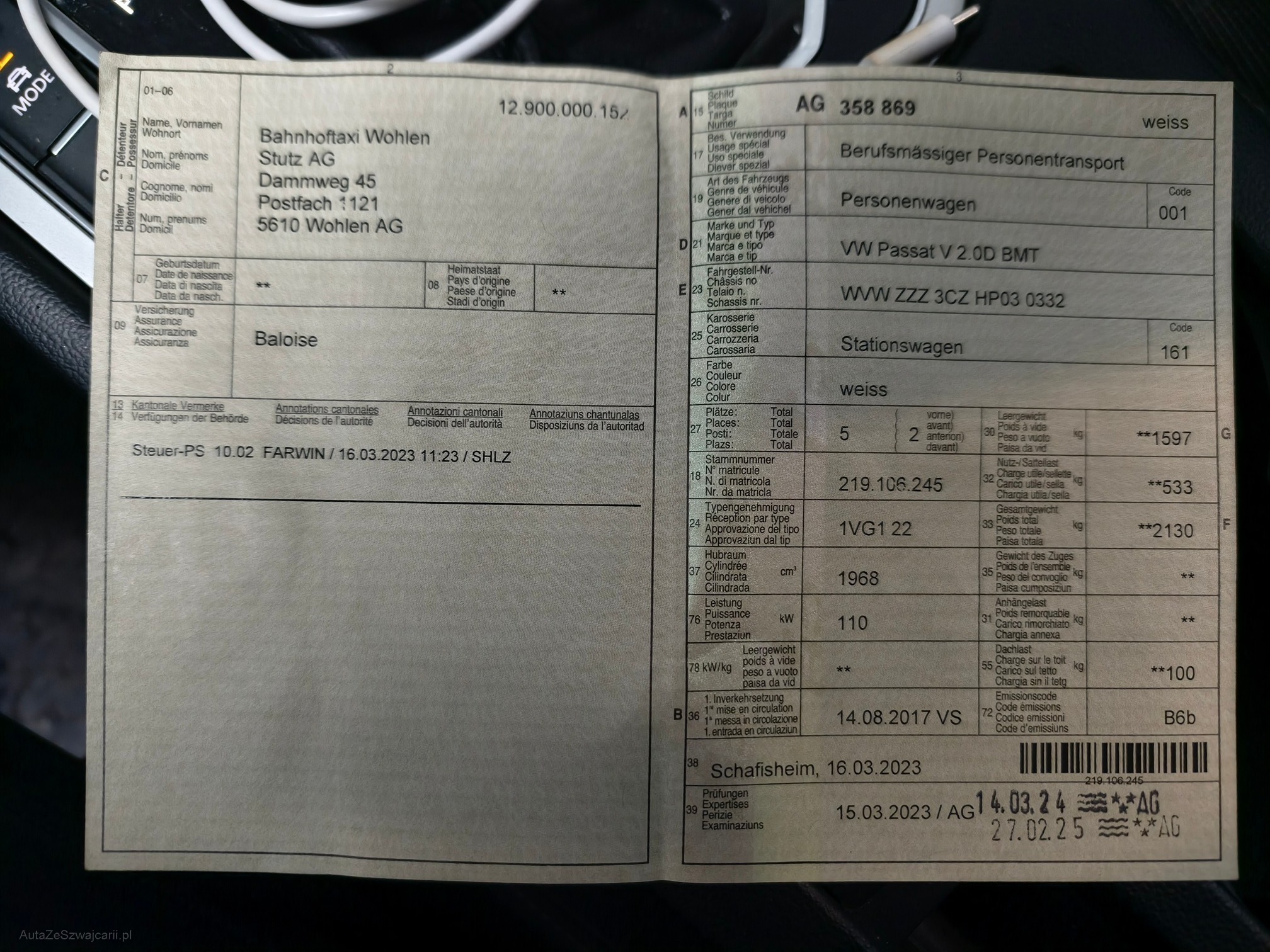 | Kommentar | Diverse Gebrauchsspuren am Fahrzeug (siehe Fotos). Taxiausrüstung werden noch ausgebaut, können aber gegen einen Aufpreis von Fr 900.- übernommen werden (Tachometer und Fahrtenschreiber). Entschriftung kann gegen Aufpreis angeboten werden. Das Risiko liegt somit vollumfänglich beim Käufer. Um Missverständnisse zu vermeiden kann das Fahrzeug auf Voranmeldung besichtigt & getestet werden. Wird davon bewusst kein Gebrauch gemacht, liegt die Verantwortung beim Käufer. Nach Zuschlag, keine Nachverhandlungen möglich. Ab Platz ohne Garantie, Wandelung und Minderung werden wegbedungen. Abholung vom Fahrzeug spätestens 10 Tage nach dem Zuschlag. Spätere Abholungen können abgemacht werden, werden jedoch mit Fr. 8.- / Tag in Rechnung gestellt. |