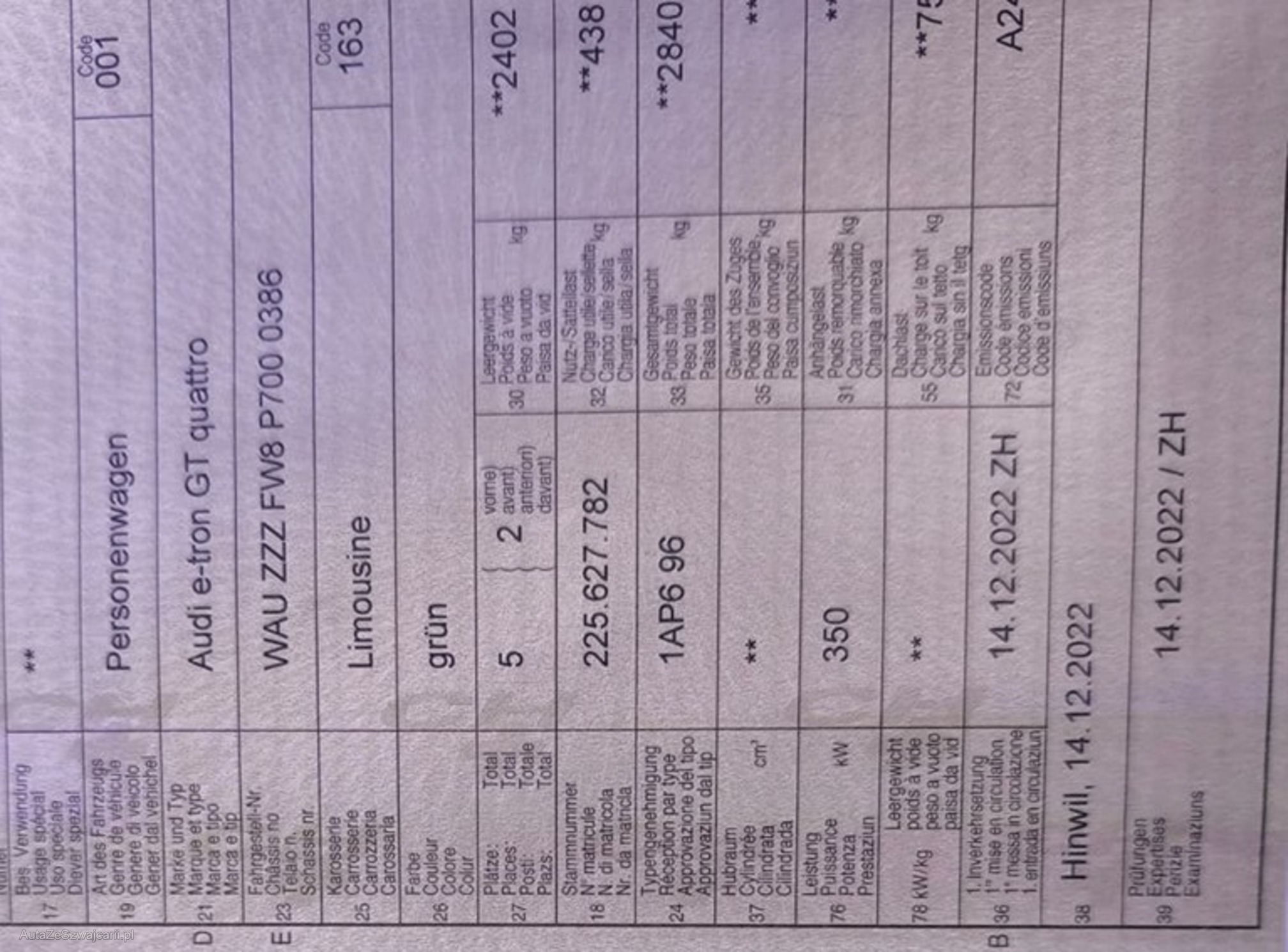 | Kommentar | 4x Original E-Tron Sommerräder und 4x Vossen Sommerräder Wir testen & kontrollieren nicht alle Funktionen vom Fahrzeug. Das Risiko liegt somit vollumfänglich beim Käufer. Nachdem der Höchstbietende den Zuschlag erhalten hat, gibt es keine Nachverhandlung, auch wenn nicht deklarierte Mängel zum Vorschein kommen sollten. Wunschpreis per Mai liegt bei 40'000.- CHF |
