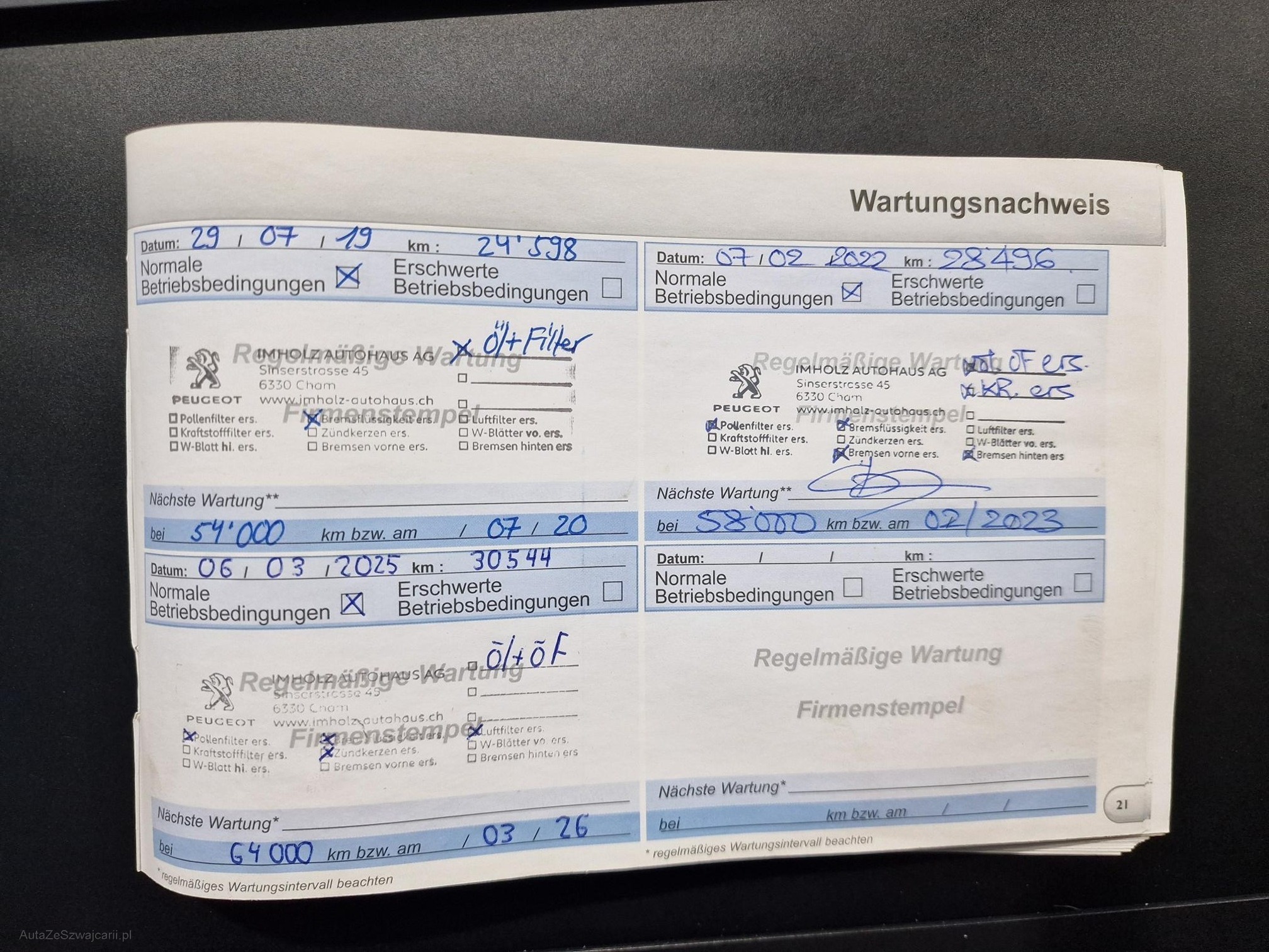 | Kommentar | Das Fahrzeug wird aufgrund von Nichtgebrauch verkauft. Am 20.03.2025 wurde bei einem Kilometerstand von 30'544 km ein grosser Service durchgeführt. Dabei wurden vier neue Winterreifen montiert, die hinteren Bremsbeläge ersetzt sowie die MFK erfolgreich durchgeführt. Nach diesem Service wurde das Fahrzeug noch ca. 250 km gefahren (Rechnung siehe Dokumente). Aufgrund der längeren Standzeit ist die Batterie etwas geschwächt, wurde jedoch geladen. Es kam zu einem leichten Wassereintritt, verursacht durch verstopfte Abläufe. Das Fahrzeug muss daher noch getrocknet werden. Die Sommerräder verfügen über ca. 70 % Profil, Produktionsdatum KW 49/2011. Die Scheinwerfer sind matt. Verkauf ab Platz, ohne Umtausch- oder Rückgaberecht. Es wurde kein Eintauschtest erstellt. Eine Besichtigung ist nach Terminvereinbarung möglich. Kontakt: Roger Syfrig Tel. |