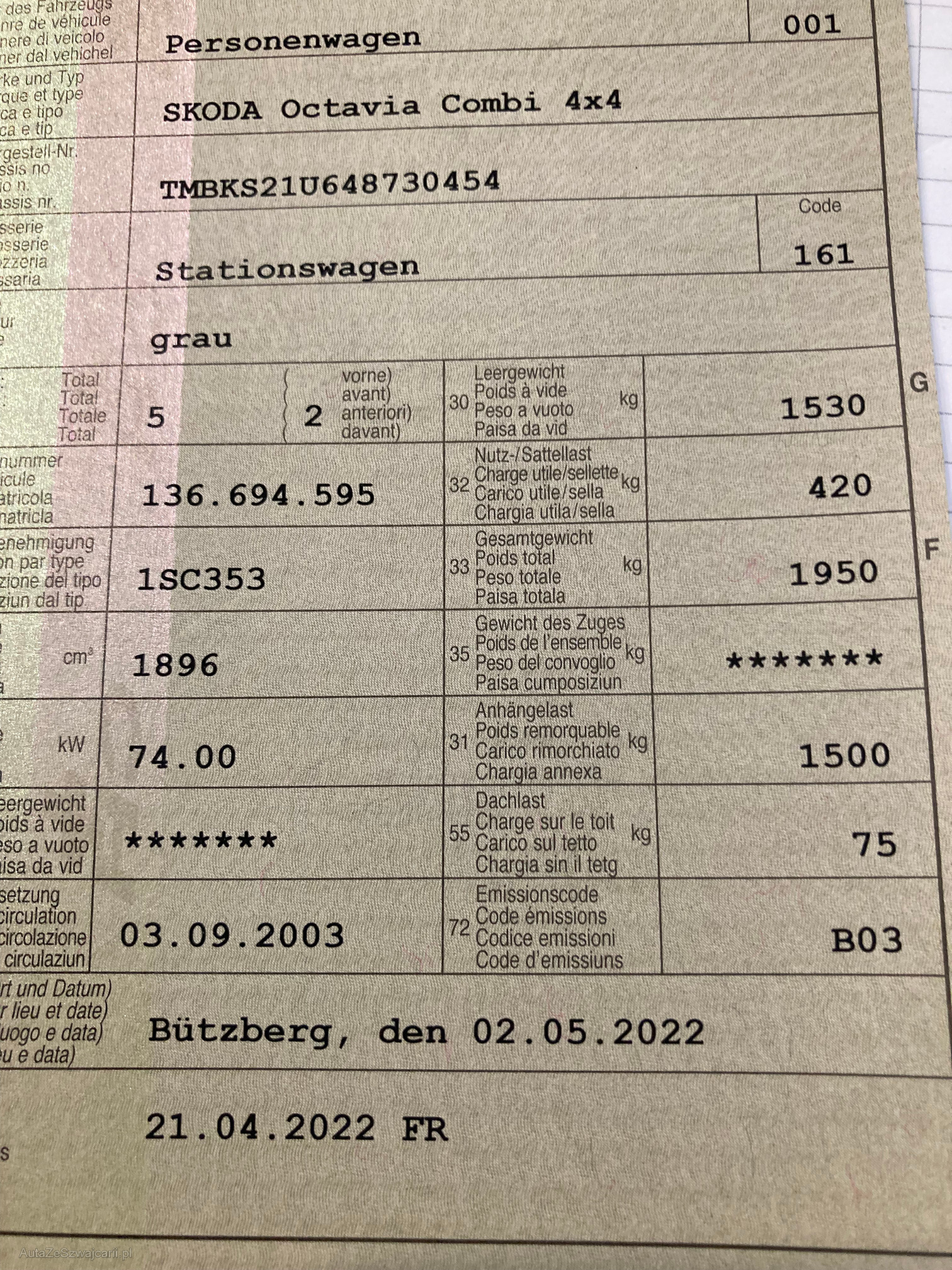| Kommentar | Im Kundenauftrag zu Verkaufen. Fahrzeug mit etlichen Mängeln für Export oder Teile Motor Läuft i.o Getriebe im 5 Gang bei entlastung Lagergeräusch Fahrzeug ist Fahrbar Am Fahrzeug wurde keine vollumfängliche Prüfung der mechanischen Teile und der Carrosserie durchgeführt! Das Risiko liegt somit vollumfänglich beim Käufer. Um Missverständnisse zu vermeiden kann das Fahrzeug auf Voranmeldung besichtigt & getestet werden. Wird davon bewusst kein Gebrauch gemacht, liegt die Verantwortung beim Käufer. Nach Zuschlag, keine Nachverhandlungen möglich. Fahrzeug ab Platz ohne jegliche Garantie und Nachwährschaft. |