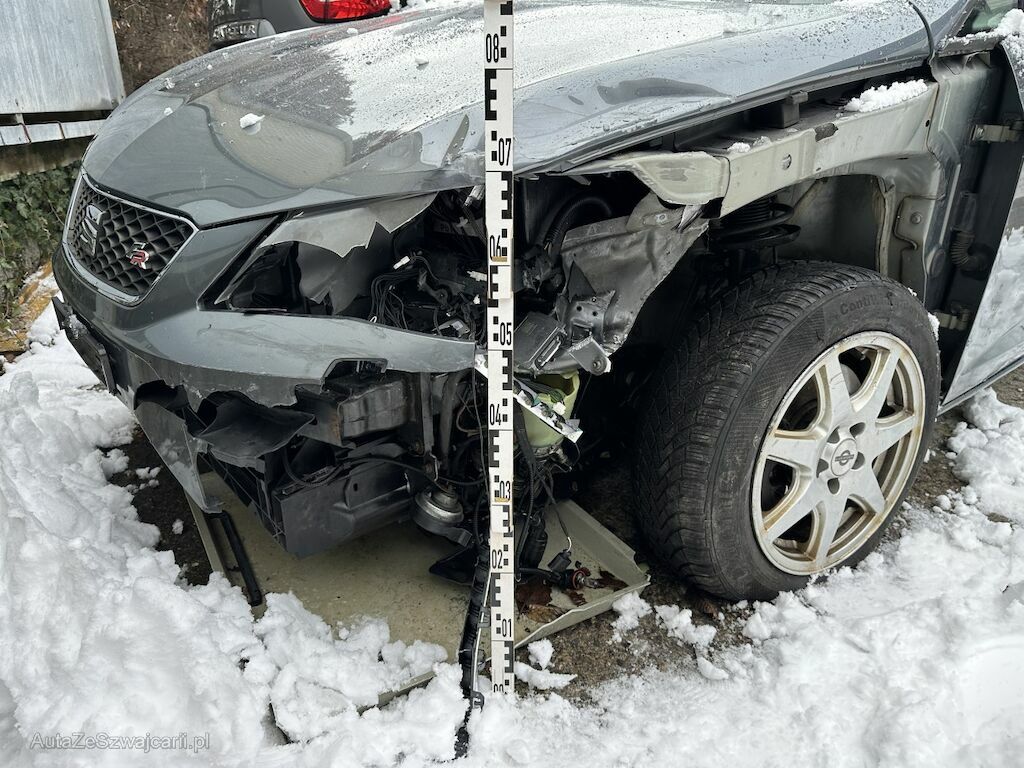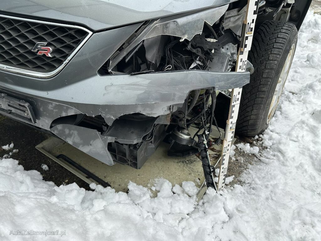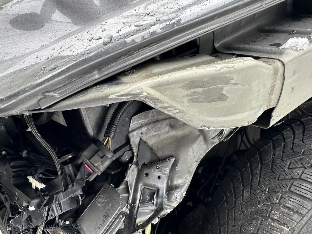 Der Kotflügel vorne links, der Schlossträger sowie die Motorhaube sind deformiert.