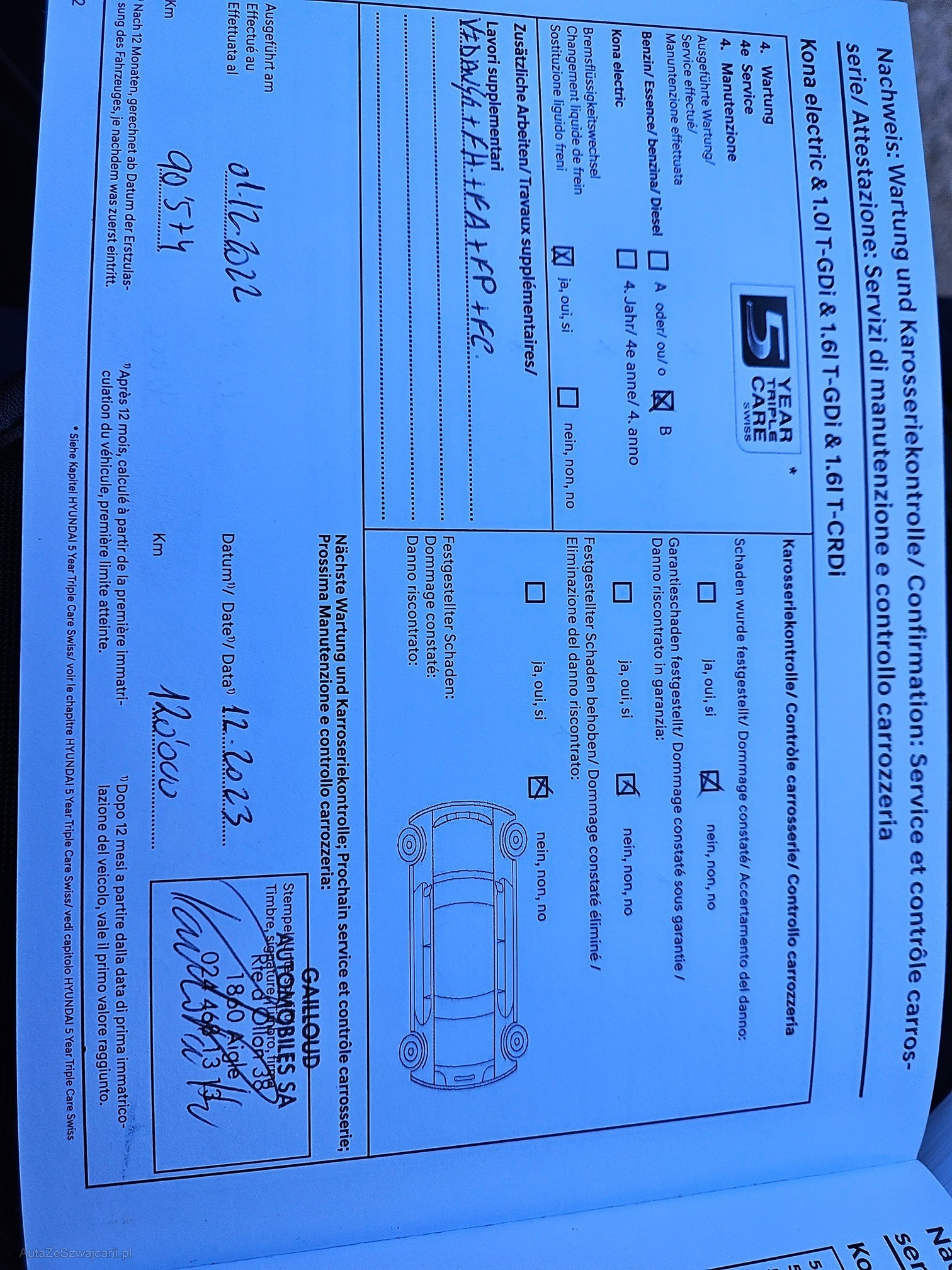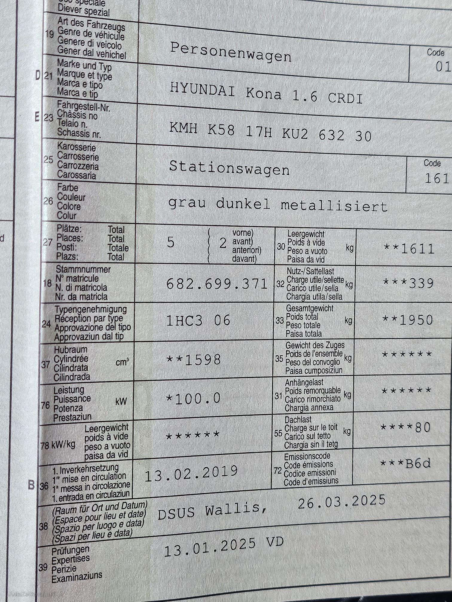 | Kommentar | Winterräder sind montiert mit neuen Winterreifen! Zusätzlich 4x Felgen sind noch vorhanden aber OHNE Reifen! Motor ist blockiert kann nicht gestartet werden deshalb muss das Auto aufgeladen werden Konnte das Fahrzeug nicht auf die Hebebühne nehmen |