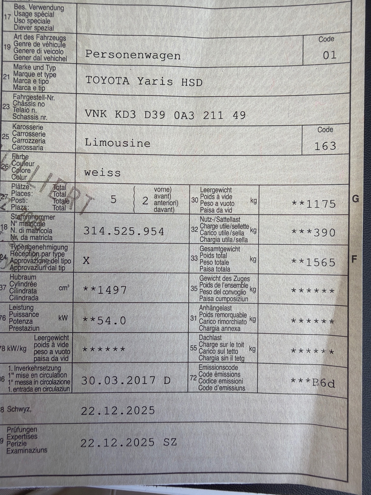 | Kommentar | Ein schöner gepflegter seltener Toyota Yaris 1.5 HSD Hybrid (Automat ) - nur 39000 Km ! -aus 1. Hand - Top Gepflegt ! - MFK 12.2025 - 8 Fach-bereift mit Neuwertigen Pneus - Mängel gemäss Fotos ( kleinichkeiten ) - Serviceheft unvollständig - Services laut Vorbesitzer bei freien Garagen durchgeführt - Keine (oder nur teilweise) Einträge im offiziellen Serviceheft |