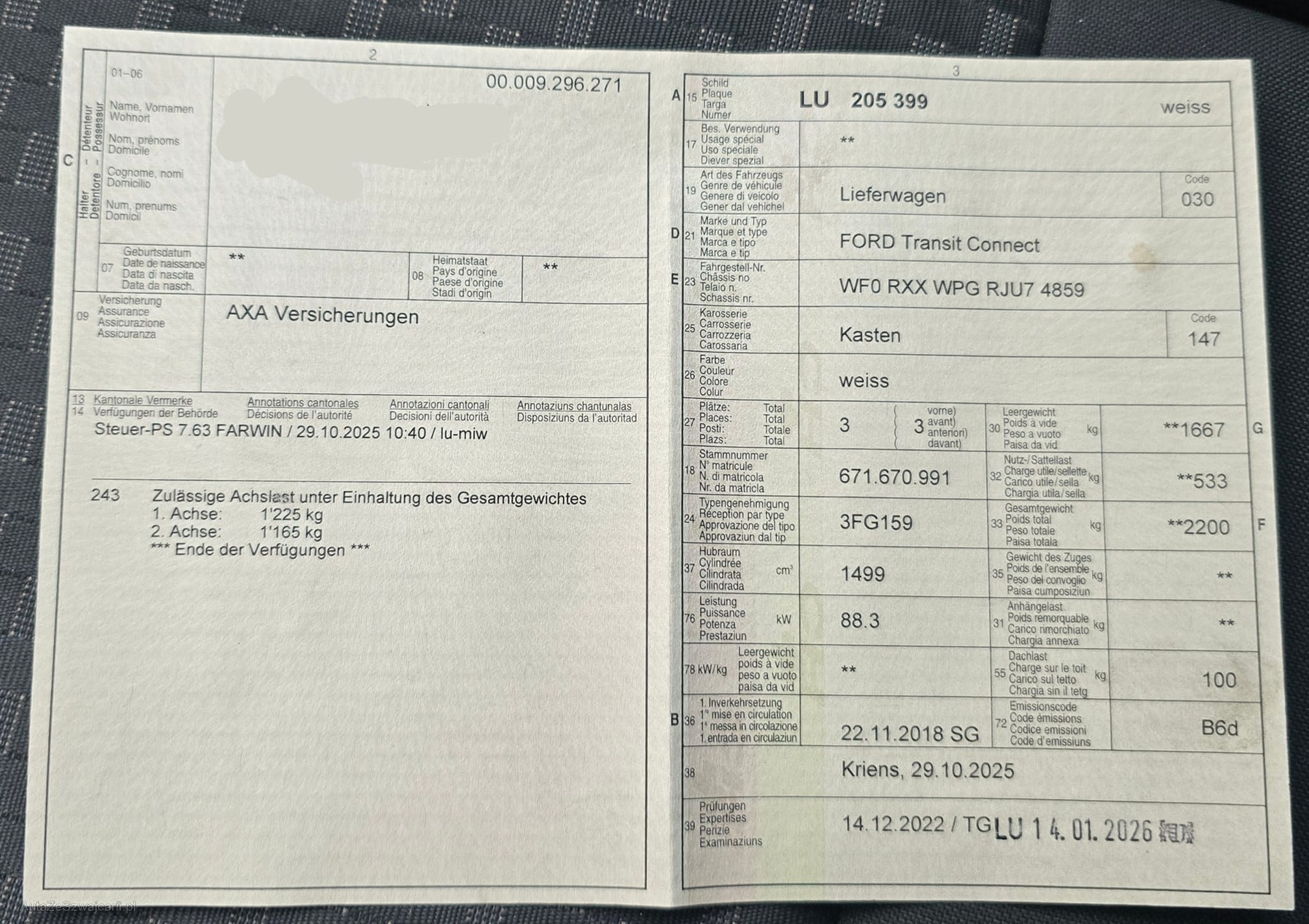 | Kommentar | Sehr gepflegtes Fagrzeug Frisch ab MFK - Partikelfilter Neu - Zahnriemen Neu - Turbo Neu Automat Sehr gute ausstattung Auto läuft einwandfrei und ist in einem Perfekten Zustand Am Fahrzeug wurde kein Werkstatttest gemacht (Für sichtbare oder nicht sichtbare Mängel wird nicht gehaftet). Wir testen und prüfen nicht alle Funktionen vom Fahrzeug. Das Risiko liegt somit vollumfänglich beim Käufer. Nach erhalt des Zuschlags, gibt es keine Nachverhandlung, auch wenn nicht deklarierte Mängel zum Vorschein kommen. Ab Platz ohne Garantie oder Gewährleistung, Wandelung und Minderung werden wegbedungen. Muss innert 3 Werktagen nach Zuschlag abgeholt werden. Kann gegen Aufpreis auch geliefert werden. Ab dem 4. Tag stehen Standgebühren an von 50Fr. pro Tag |