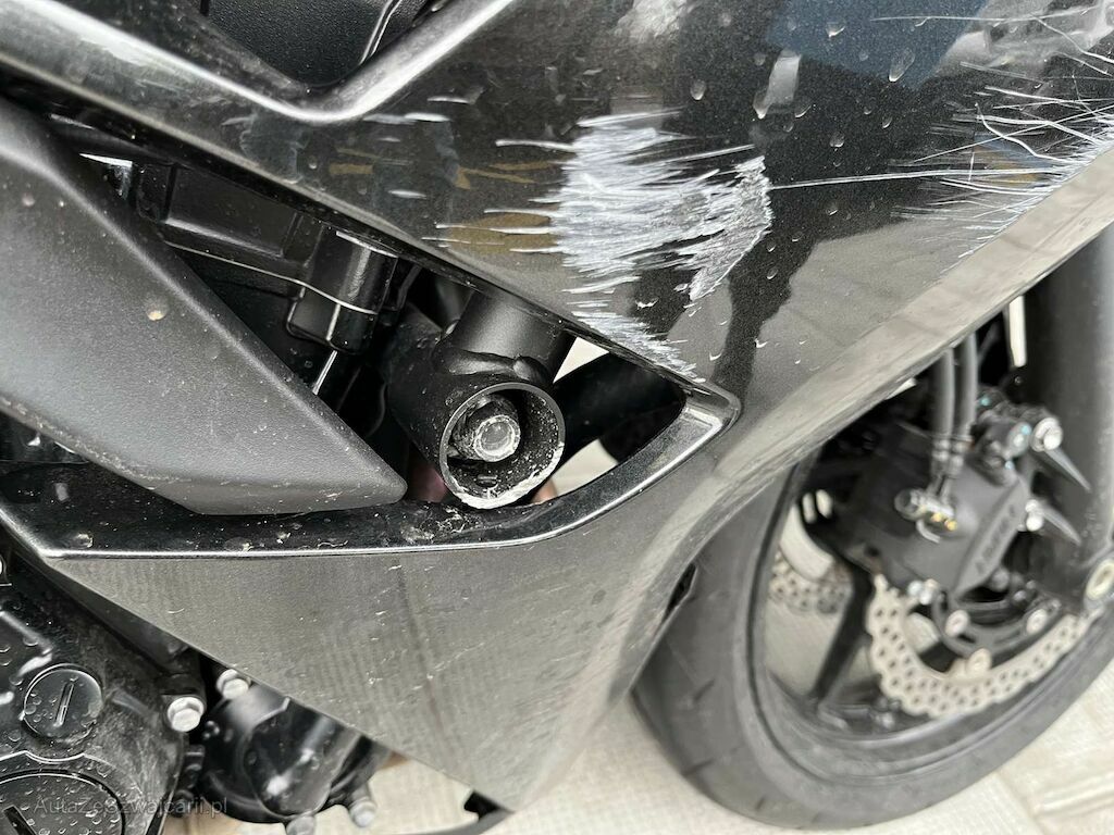 Rétroviseur droit, levier de frein avant, embout de guidon, demi guidon, tête de fourche, carénage avant droit, pied de fourche droit, carénage latéral droit, cadre, levier de frein arrière, repose pied, carénage arrière endommagés et râpés.