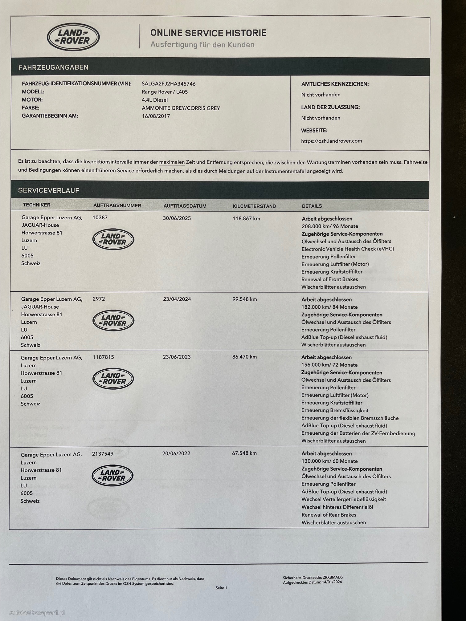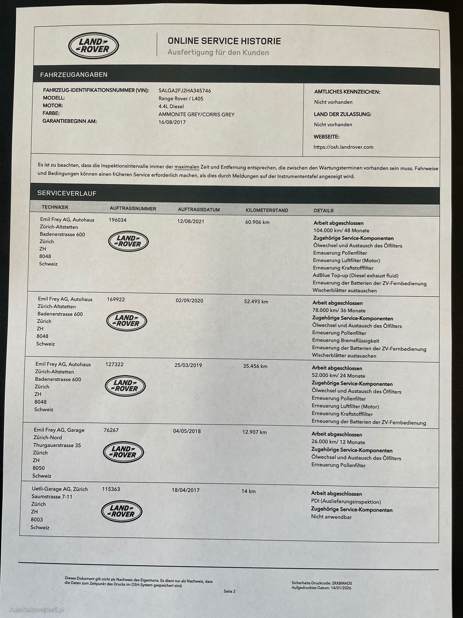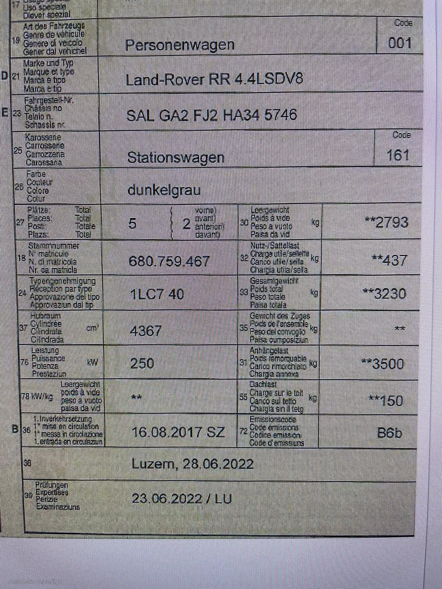 | Kommentar | Fahrzeug hat diverse Kratzer um die Carrosserie. Vorne links Radlauf Beule. Heckleuchte hinten links hat Wasser im Gehäuse. Alle Felgen sind zerkratzt Partikelfterttest bestanden Bremsen hinten noch ca 5-8 Tkm Schiebedach ohne Funktion. Wurde aber noch nicht geprüft und Diagnose gemacht. Immer bei LR im Service gehabt. Motor i.O. |