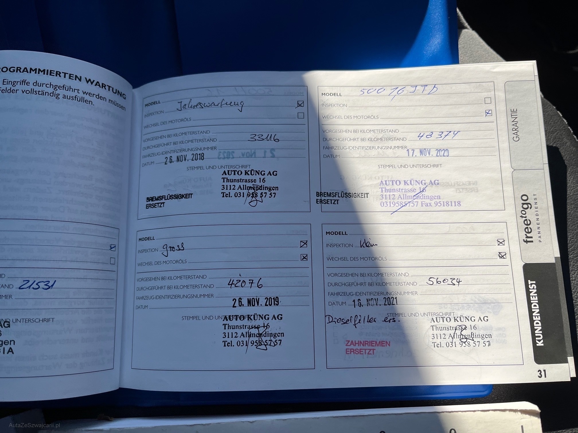 | Kommentar | Zustand gemäß Fotos! Insgesamt sauber! Wurde von ältere Dame gefahren, alle Service immer gemacht! DPF wurde vor kurzem geprüft, ist io! Fz fährt einwandfrei! Zahnriemen wurde ersetzt! Fz muss nach Zuschlag innerhalb 5 Arbeitstagen abgeholt werden, ansonsten werden Fr. 15.- Standgebühren / Tag verrechnet! |