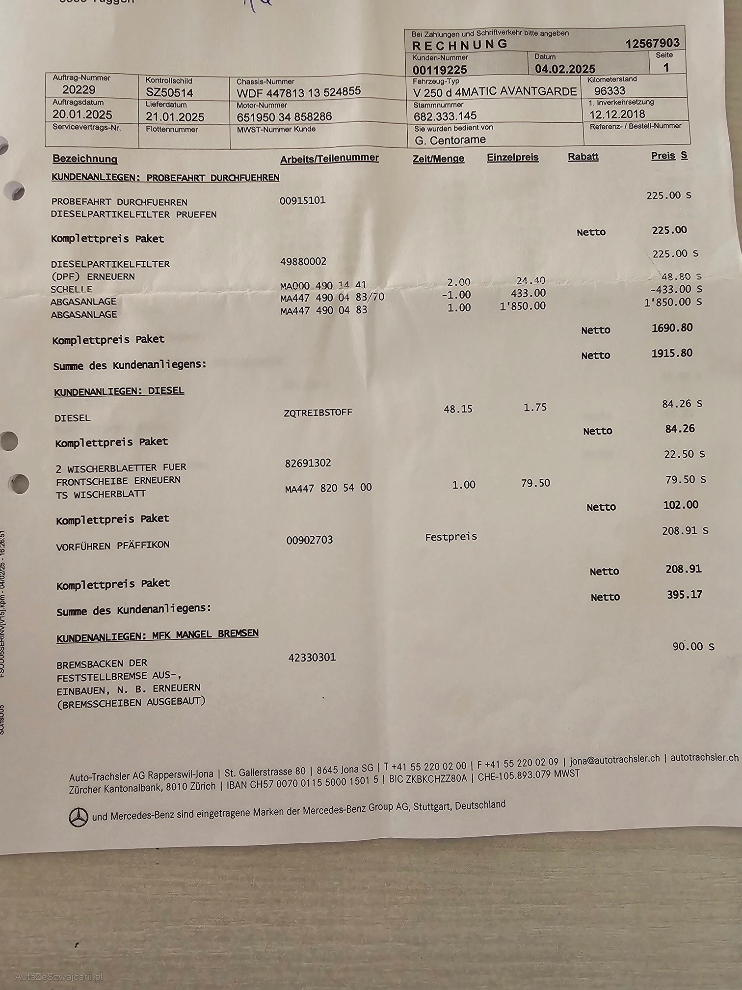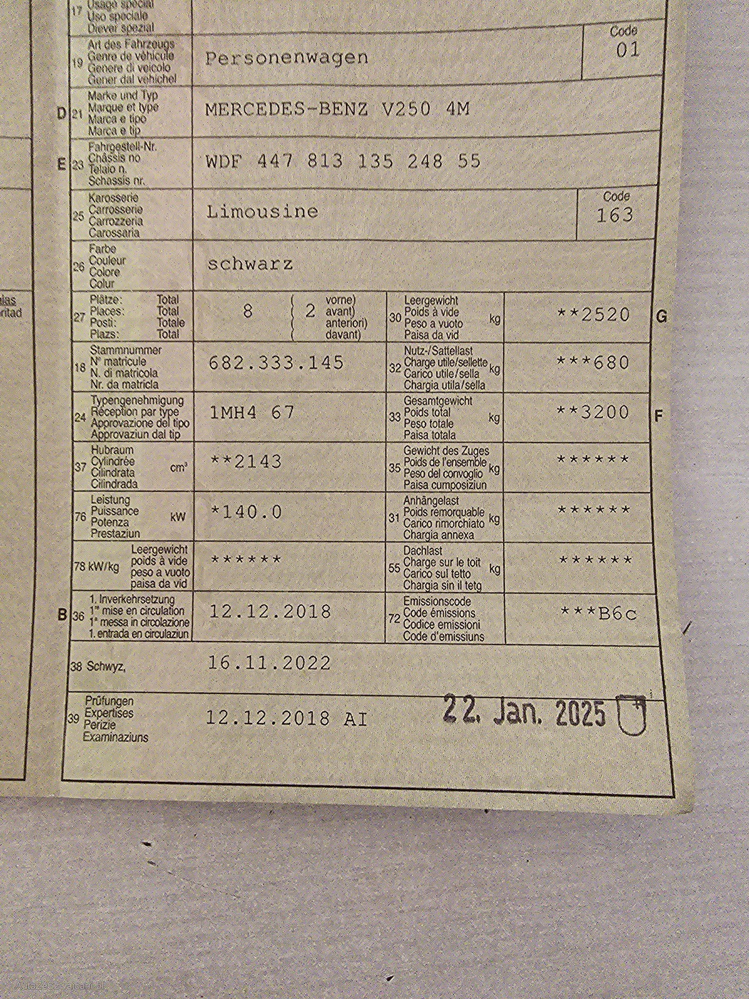 | Kommentar | Top Gepflegter Mercedes V250 4M Allrad!!!! Innen und Aussen dem Alter entsprechende Gebrauchsspuren aber sonst Top Gepflegt. Fährt und funktioniert einwandfrei jedoch keine technische Prüfung. Neuer Partikelfilter und komplett neue Bremsen hinten. Mit Rechnung vom 2.2025!! Inkl. Winterräder auf Alufelgen mit 6mm Profil. Sommerreifen ebenfalls gut. |