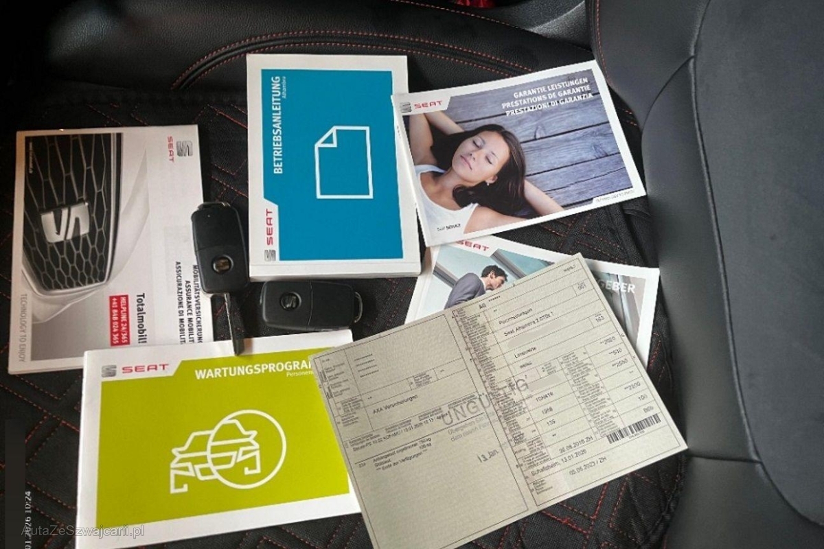 | Sonderausstattung | Technikpaket I (Absenkung Beifahrerspiegel bei Rückwärtsfahrt, Assist: Automatische Parkbremse, Steckdose 220/230V), Transport Paket (Sicherungsnetz für Ladegut, Sicherheitstrennnetz oder /-gitter im Gepäckraum, Schienensystem im Laderaum), Lackierung: Uni-Lackierung Pure White, Media: SEAT FullLink, Anhängervorrichtung (Einklappbar), Sitze: Fahrersitz mit Massagefunktion, Airbag: Seitenairbags hinten, Panorama-Schiebedach, SEAT Garantie: Garantie 3. und 4 Jahre oder 80'000 km (ab 1. Inv.) |