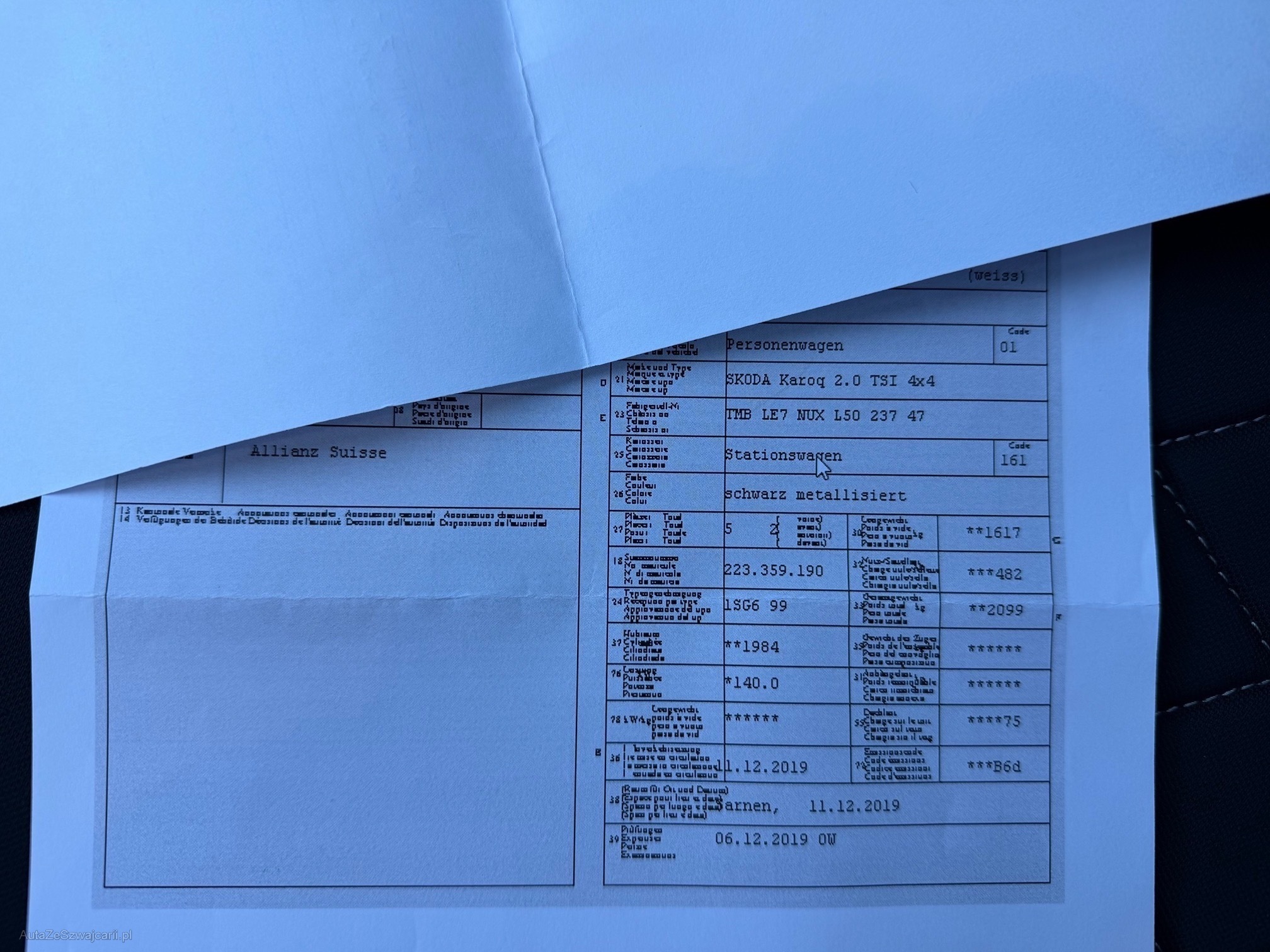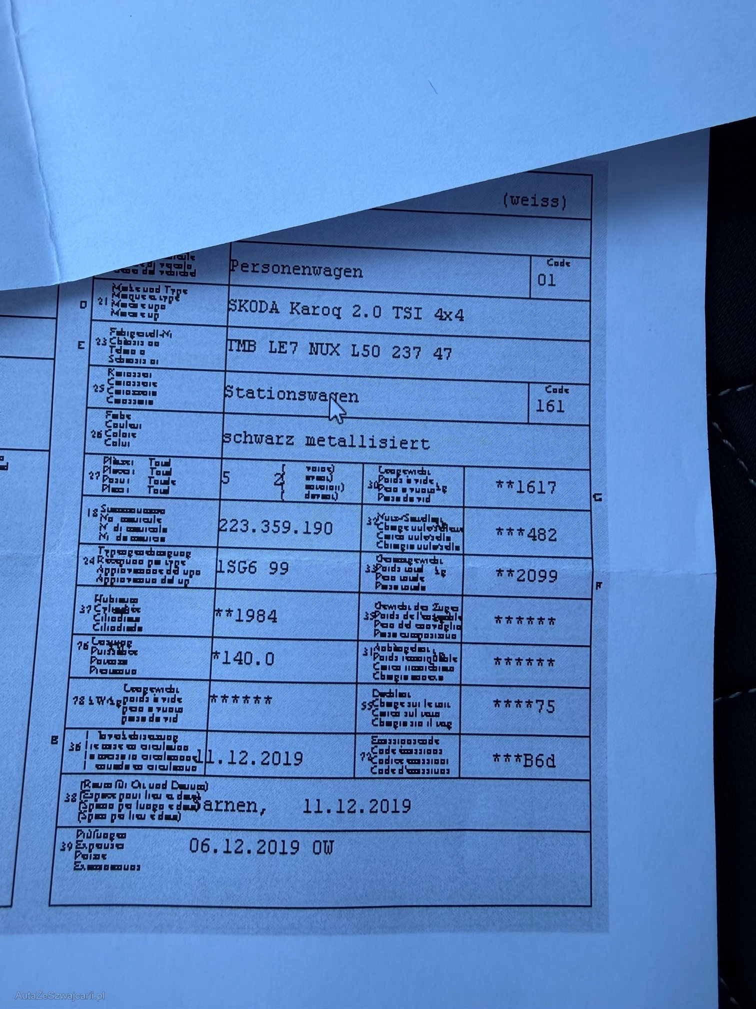 | Kommentar | Hagelschaden Dach, div. Beulen und Kratzer(Bilder), Mechatronik ab und zu Probleme, keine technische Prüfung. Ab Platz ohne Garantie, jede Gewährleistung soweit nach Gesetz möglich, insbesondere Wandelung und Minderung wird wegbedungen. Fahrzeug muss innerhalb von fünf Arbeitstagen abgeholt werden. Nachher 20.- sFr. Pro Tag Standgebühren. |