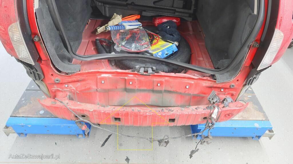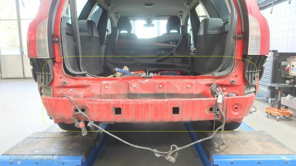 Stossstangenabdeckung hinten gerissen, Querträger hinten gestaucht, Heckblech hinten eingedrückt, Seitenversteifung Heckblech verformt, Heckklappe eingedrückt, Heckscheibe gebrochen, Heckleuchte links gebrochen, Kabelstrang hinten beschädigt, PDC-Sensoren beschädigt.