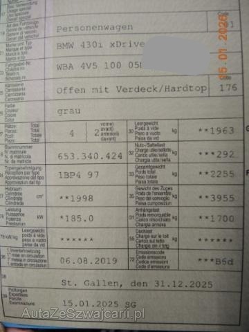 | Condition_and_Equipment | Links Linke Seite beschädigt. Anstoss links im Bereich der A-Säule. Anstoss links im Bereich der B-Säule. Achse Risiko Vorderachse. --- Serienaustattung Seitenairbag für Fahrer und Beifahrer Radio BMW Professional Elektrische Sitzverstellung mit Memory Reifendruck-Kontrollsystem RDC Aussenspiegel elektrisch verstellbar Durchladesystem Regensensor Dynamische Stabilitäts-Control DSC Antiblockiersystem ABS Servotronic Fahrer und Beifahrer-Airbag Velours-Fussmatten Multifunktions-Lenkrad Pack Licht Dynamische Traktions-Control DTC Armauflage vorn verschiebbar Geschwindigkeitsregelung mit Bremsfunktion Deaktivierung Beifahrerairbag Klimaautomat 2-Zonen inkl. Mikrofilter Digital audio DAB-Tuner Interieurleisten Satinsilber matt Auto Start Stopp Funktion Freisprecheinrichtung mit USB-Schnittstelle LED-Nebelscheinwerfer Keine Gewähr auf die Angaben der Serienausstattungen Leichtmetallräder Sternspeiche 393 ConnectedDrive Services Remote Services LED-Scheinwerfer BMW Service Plus 10 Jahre/ 100'000 km Ottopartikelfilter Sonderausstattung Lenkradheizung Lordosenstütze für Fahrer und Beifahrer Innen- und Aussenspiegel automatisch abblendbar Anhängerkupplung Metallic-Lackierung Windschutz Diebstahlwarnanlage Navigationssystem Professional Leder Dakota Komfortzugang Park Distance Control PDC vorn und hinten Head-Up Display Fernlichtassistent Rückfahrkamera Aktive Geschwindigkeitsregelung mit Stop&Go Funktion Interieurleisten BIN Pianolack schwarz Spurwechselwarnung Adaptives M Fahrwerk Harman/Kardon Surround Sound System Speed Limit Info Surround View Kameras Parkassistent Active Protection Adaptive LED-Scheinwerfer Multifunktionales Instrumentendisplay Nackenwärmer Telefonie mit Wireless Charging Driving Assistant |