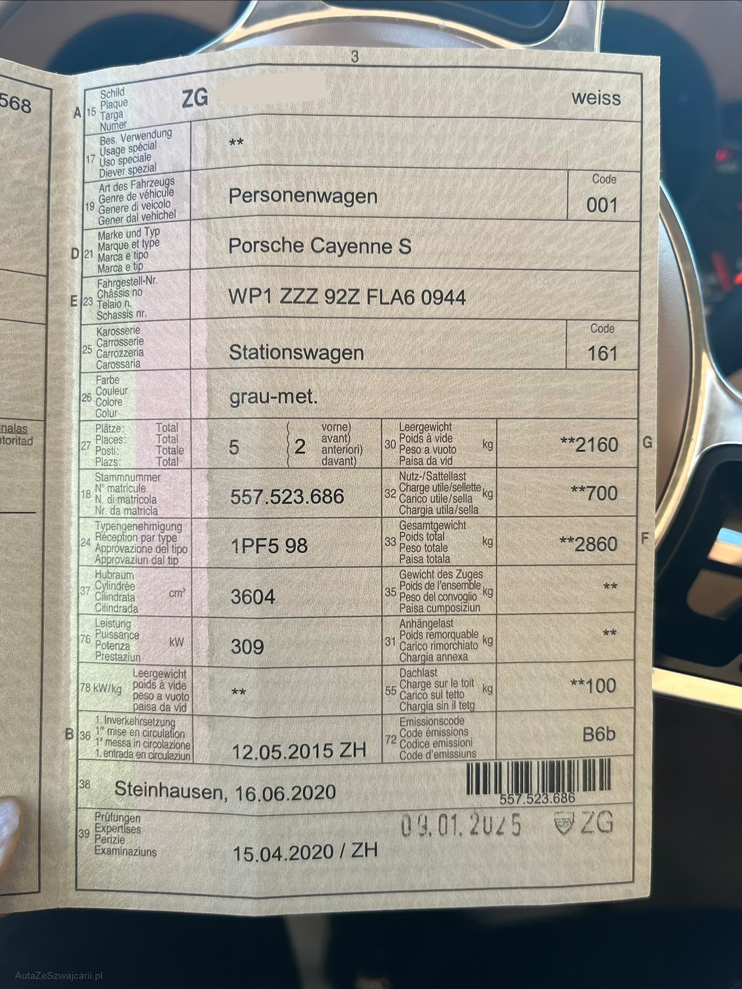 | Kommentar | Schöner Cayenne S sofort verfügbar! Bremsen Vo & Hi im 03/2024 gemacht 8-fach Sommerreifen, Winter montiert MFK 01.09.2025 Durchgeführte Arbeiten: Nockenwellensensor Ein & Auslassbank 1 wurden ersetzt. Weiterhin bestehende Fehlermeldung Störung Motorsteuerung. Weitere Diagnose nötig. Aktuell fahrbar aber auf eigenes Risiko. Abholung mit Anhänger empfohlen. Keine Nachverhandlungen, ab Platz und ohne jegliche Garantie |