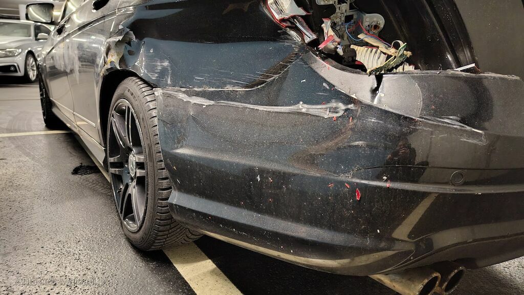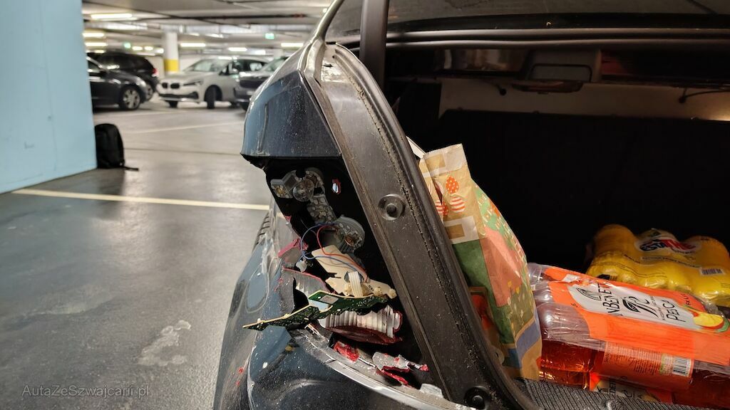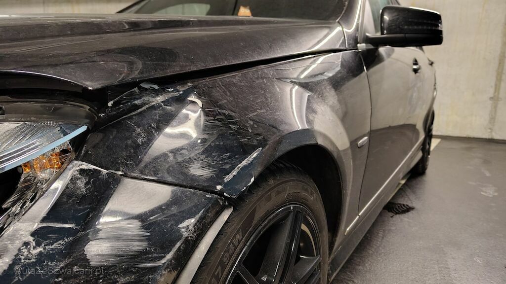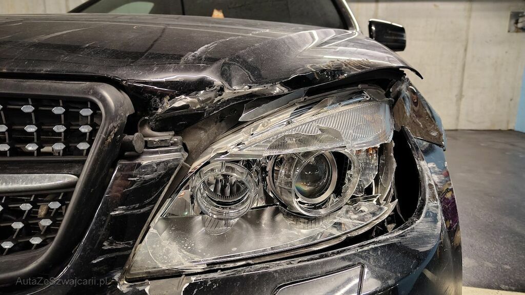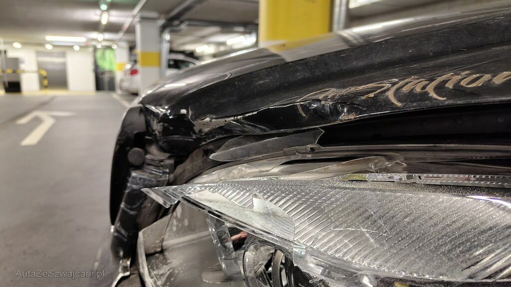 Seitenschaden links: Stossstange hinten eingedellt, gerissen und zerkratzt. Heckleuchte beschädigt. Seitenwand stark eingedellt und zerkratzt. Türe hinten lässt sich nicht öffnen. Reifen Seitenwand hinten beschädigt. Kotflügel eingedellt und aufgeschoben. Scheinwerfer beschädigt. Stossstange vorne eingedellt, gerissen und zerkratzt. Motorhaube aufgeschoben und eingedellt. Kühlergrill beschädigt.