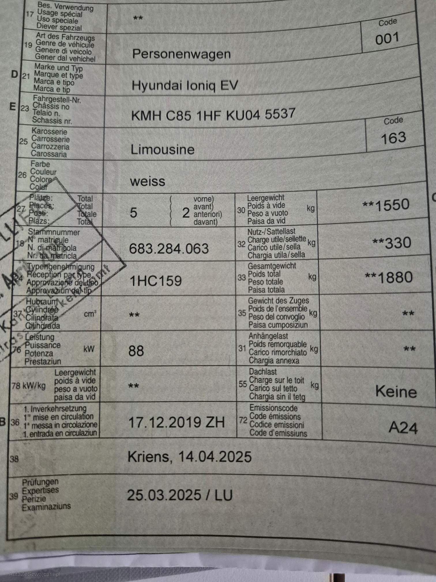 | Kommentar | Frisch ab Service MFK im März 2025 ausgeführt. Hochvoltbatterie Garantie 8 Jahre / 200'000km ab 1. Inverkehrssetzung. Für sichtbare und nicht sichtbare Mängel wird nicht gehaftet. Keine Garantie, Keine Minderung und/oder Wandelung möglich. Keine Nachverhandlungen. |