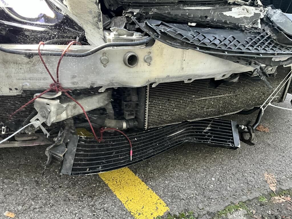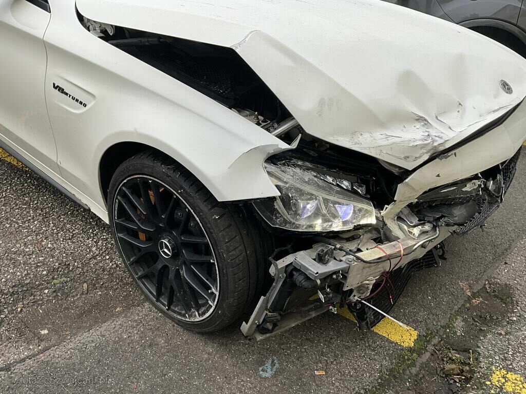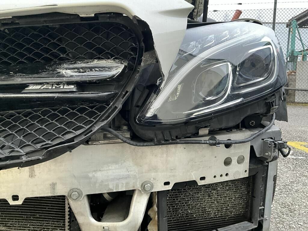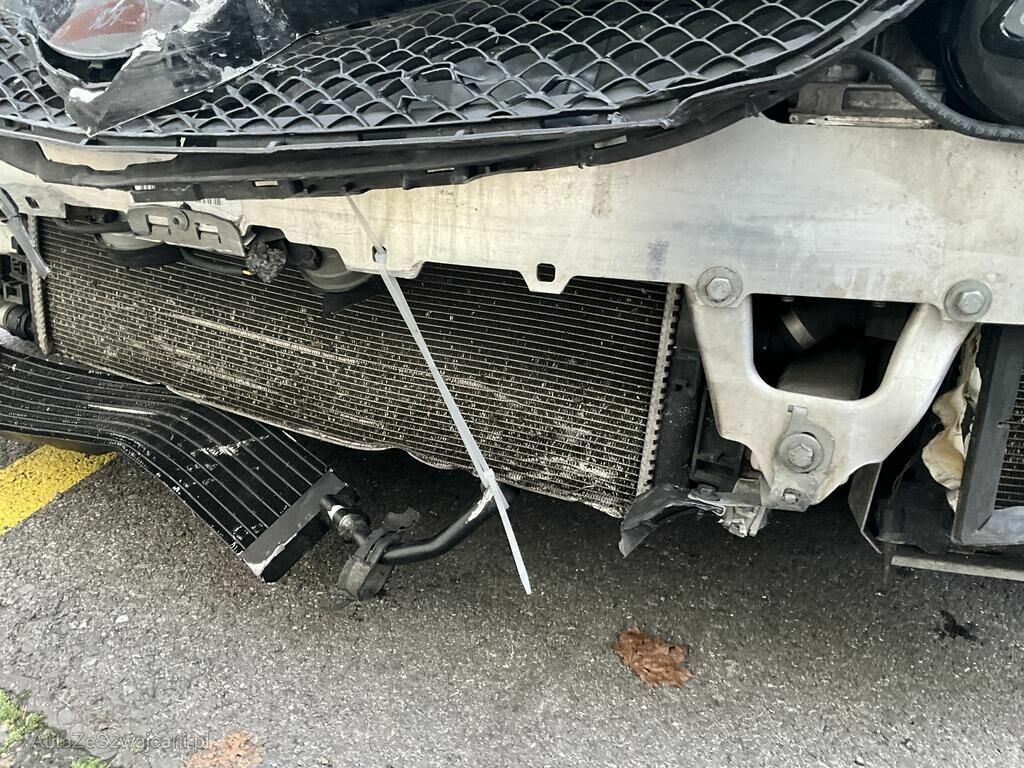 Pare chocs AV, calandre, phares AV, radiateur, condenseur, échangeur, ventilateur, masque AV, calandre, radar AV, jante AVD endommagés. Capot, aile AVD enfoncés. Train AVD plié.