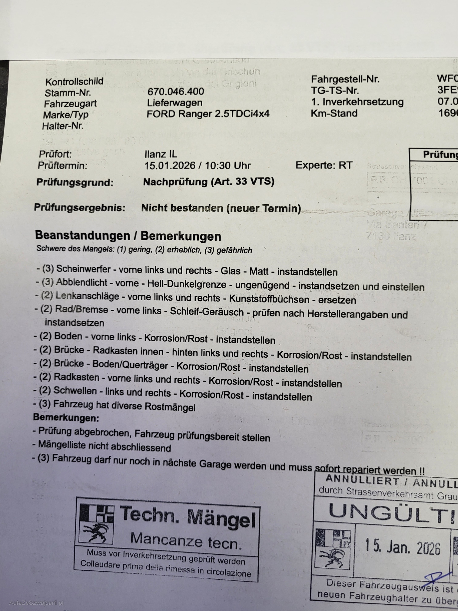 | Kommentar | Diverse Rost & Lackschäden Diverse Technische Mängel (s. Prüfbericht) Chassis ist nicht durchrostet (nur Karrosserie) Ab Platz - Ohne Garantie Die gesetzliche Gewährleistung, insbesondere Wandelung, Minderung oder Ersatzlieferung, ist ausgeschlossen. |