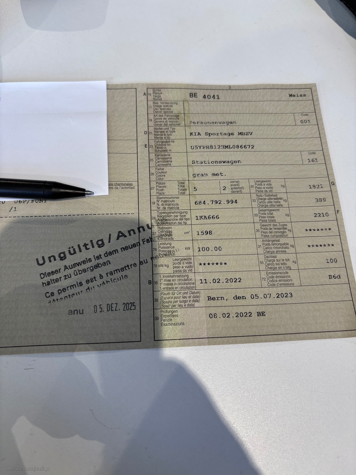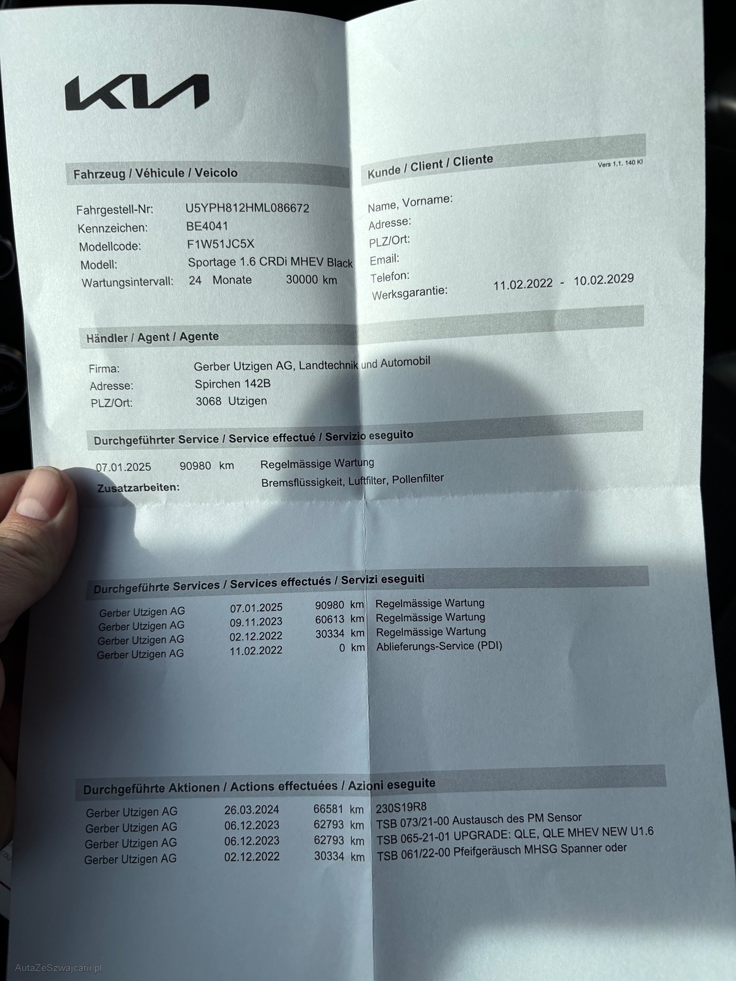 | Kommentar | Gepflegtes Auto mit fortlaufender Kia Werksgarantie Dieselpartikeltest erfolgreich bestanden, siehe Foto 8-Fach Bereift, Winterreifen mehr als 7mm , Sommerreifen mehr als 4mm Folgende Mängel sind bekannt: Steinschlag, kleiner Hagelschaden, kleine Kratzer siehe Fotos letzter Service 07.01.2025, bei 90'980km MFK - letzter Termin 11.02.2022 (1. Inverkehrssetzung) Fahrzeug ab Platz: Für sichtbare und nicht sichtbare Mängel wird nicht gehaftet. Keine Garantie, Keine Minderung und/oder Wandelung möglich. Keine Nachverhandlungen. Kein Werkstatt-Test durchgeführt. Barbezahlung bei Abholung des Fahrzeuges. |
