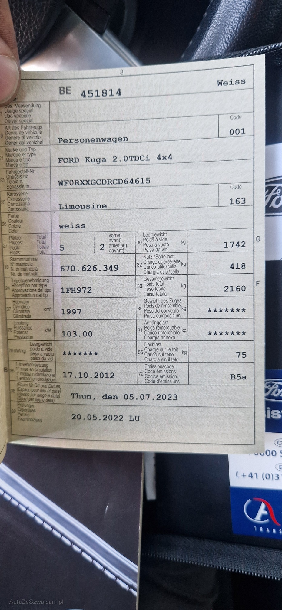 | Kommentar | Schöner Ford Kuga 4x4 TDCI Das Fahrzeug fährt, schaltet und bremst einwandfrei. Macht einen gepflegten Eindruck, wurde stets gewartet. Hat auf der Haube ein Beulchen ( siehe Bild ) Sonst gut in Schuss was von Aussen & oben beurteilt werden konnte. Am Fahrzeug wurde keine vollumfängliche Prüfung der mechanischen Teile und der Carrosserie durchgeführt! Das Risiko liegt somit vollumfänglich beim Käufer. Um Missverständnisse zu vermeiden kann das Fahrzeug auf Voranmeldung besichtigt & getestet werden. Wird davon bewusst kein Gebrauch gemacht, liegt die Verantwortung beim Käufer. Nach Zuschlag, keine Nachverhandlungen möglich. Ab Platz ohne Garantie, Wandelung und Minderung werden wegbedungen. |