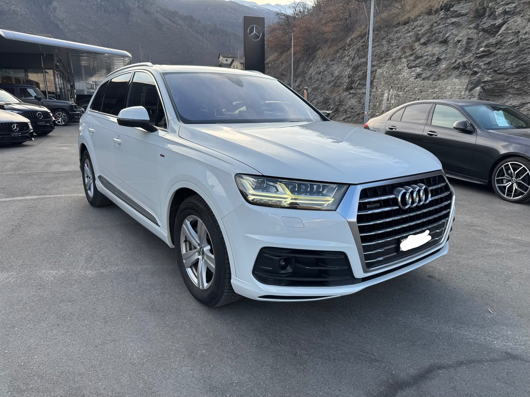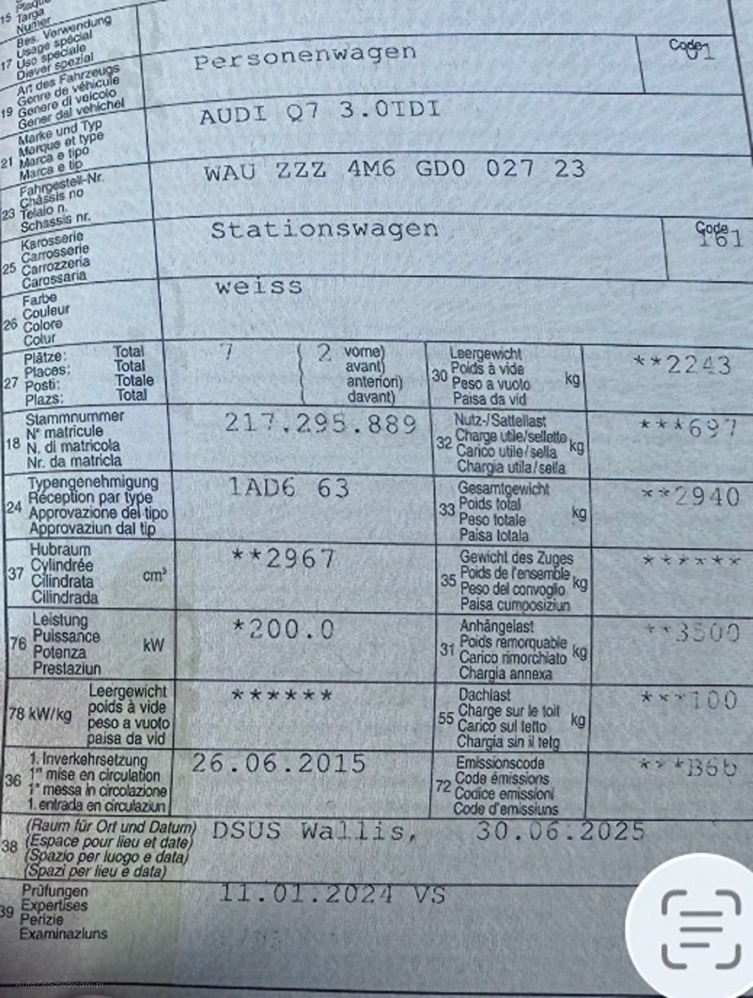 | Kommentar | Audi Q7 in gutem Allgemeinzustand, 7 Sitze, Winterräder wie auf Foto und nur Sommerfelgen ohne Reifen. Beim Fotografieren ist ein metallisches Geräusch zu hören, das klingt, als würde ein Blechteil gegen etwas stoßen. Bei einer kurzen Probefahrt des Fahrzeugs war das Geräusch nicht zu hören. Am Fahrzeug wurde kein Werkstatttest gemacht (Für sichtbare oder nicht sichtbare Mängel wird nicht gehaftet). Wir testen und prüfen nicht alle Funktionen vom Fahrzeug. Das Risiko liegt somit vollumfänglich beim Käufer. Nach erhalt des Zuschlags, gibt es keine Nachverhandlung, auch wenn nicht deklarierte Mängel zum Vorschein kommen. Ab Platz ohne Garantie oder Gewährleistung, Wandelung und Minderung werden wegbedunge |