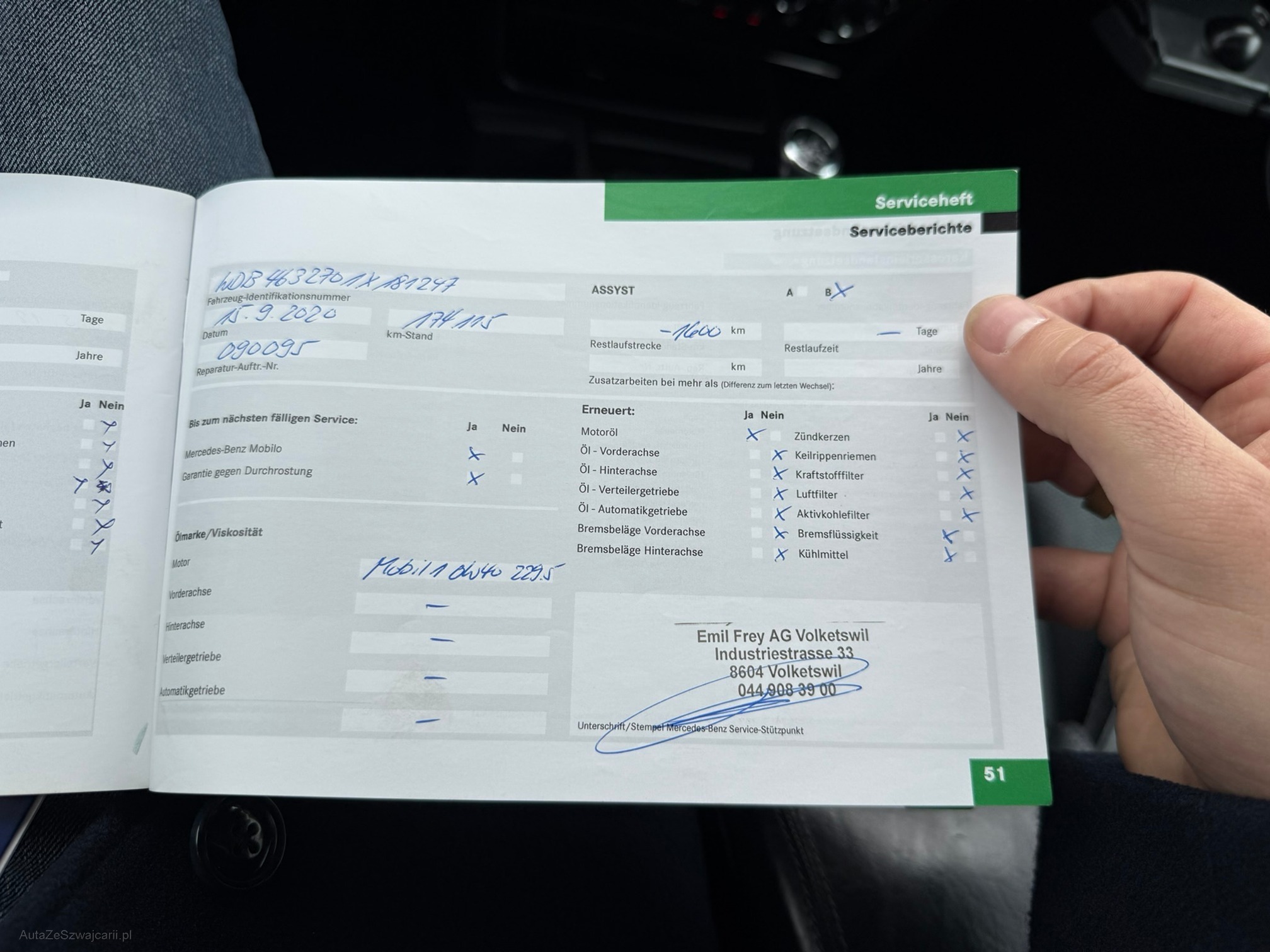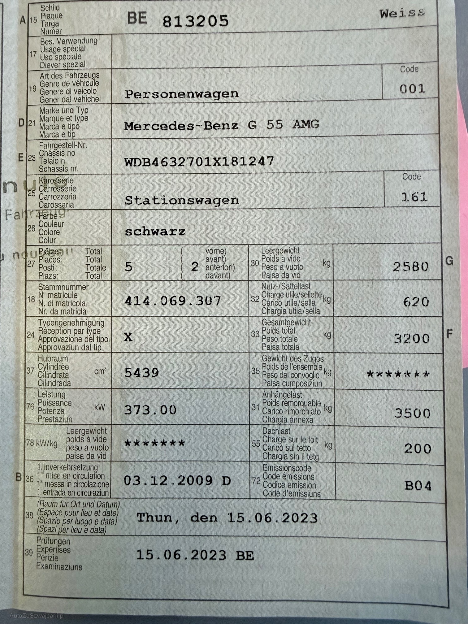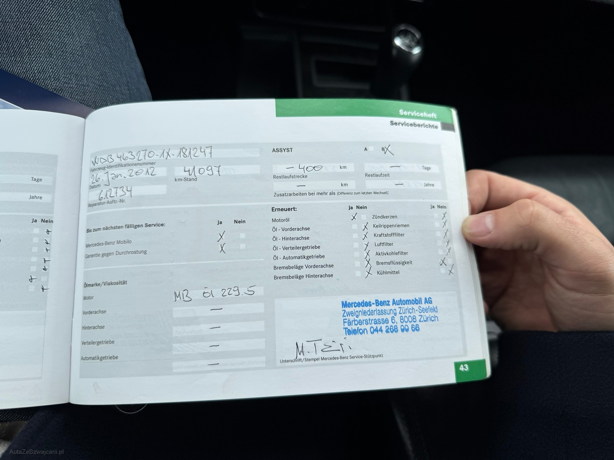 | Kommentar | Gepflegter G55 AMG Fährt und schaltet sich angenehm 2 Schlüssel; 4-fach bereift mit guten Winterreifen Letzter Service (Gross) 03/2025 inkl. neuer Lenkgeometrie Vorbesitzer hat viel in Rostbehandlung investiert (Scheibenrahmen, Carrosserie-Fälze, Türrahmen usw.) Der Wagen steht sehr gut da und hat nur wenige Kratzer im Lack. Innenraum ist sehr gepflegt. Fahrersitz hat nur leichte Abnutzungen. Softlack an Mittelkonsole löst sich an vereinzelten Stellen etwas. Klarlack von Innenraumzierleisten und Lenkrad teilweise gerissen Facelift-Frontstange mit originalem 63er Stossfänger in Wagenfarbe (originaler 55er Stossfänger ist vorhanden und wird mitgegeben) Direktimport aus DE; Serviceheft vorhanden und regelmässig gewartet Einträge Serviceheft: Am 20.12.2010 bei 21'606km (Daimler AG, Stuttgart) Am 26.01.2012 bei 41'097km (ab hier in CH) Am 11.12.2012 bei 58'331km Am 22.01.2014 bei 76'398km Am 04.03.2015 bei 93'251km Am 16.02.2016 bei 108'841km Am 15.03.2017 bei 126'643km Am 08.05.2018 bei 141'776km Am 24.04.2019 bei 153'680km Am 15.09.2020 bei 174'115km Am 07.10.2023 bei 198'234km Am 24.03.2025 bei 201'234km (Motorenöl und -filter; Luftfilter; 16 Zündkerzen; Pollenfilter; Achsöle VA und HA; Lenkgeometrie) Sehr interessante Sonderausstattung wie: Sitzheizung und -klimatisierung vorne; Sitzheizung hinten; Lenkradheizung; Standheizung; Alcantara Dachhimmel; Designo Lederausstattung; Xenon-Scheinwerfer; Rückfahrkamera; Navi; Tempomat; Schiebedach; AHK 3500kg; Harman Kardon Soundsystem Mängel: - Leichter Motorölverlust - MFK fällig - Keine Sommerbereifung - Felgen sind teilweise verkratzt - Fehlermeldung Nebelleuchten (sind in originaler 55er Stossstange vorhanden) Ohne jede Garantie. Zustand gemäss Bilder. Es wurde kein Test am Fahrzeug vorgenommen. Für sichtbare und unsichtbare Mängel wird keine Haftung übernommen. Kauf auf eigenes Risiko. Jede Gewährleistung, soweit nach Gesetz möglich, wird wegbedungen. Insbesondere sind Wandelung und Minderung ausgeschlossen. |