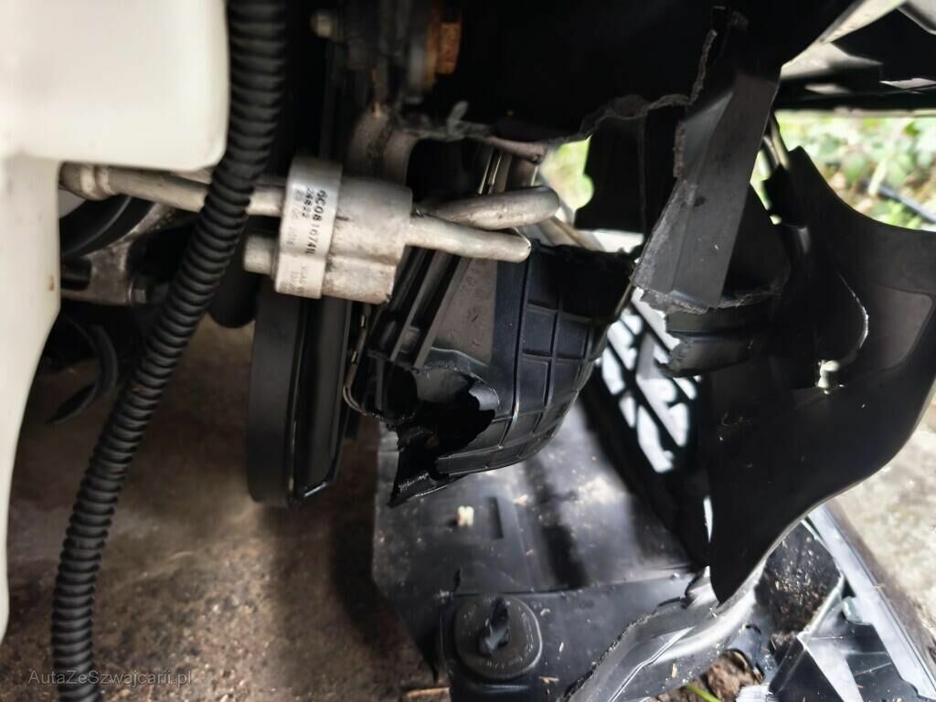 Pare-chocs avant, ailes avant gauche et droite, aile arrière droite, tôle frontale, radiateurs, ventilateurs, carter moteur, berceau moteur, roue avant droite, mécanique de roue avant droite, roue arrière droite, mécanique de roue arrière droite, soubassement du véhicule, encadrement de porte droite et vitre de porte droite, etc...