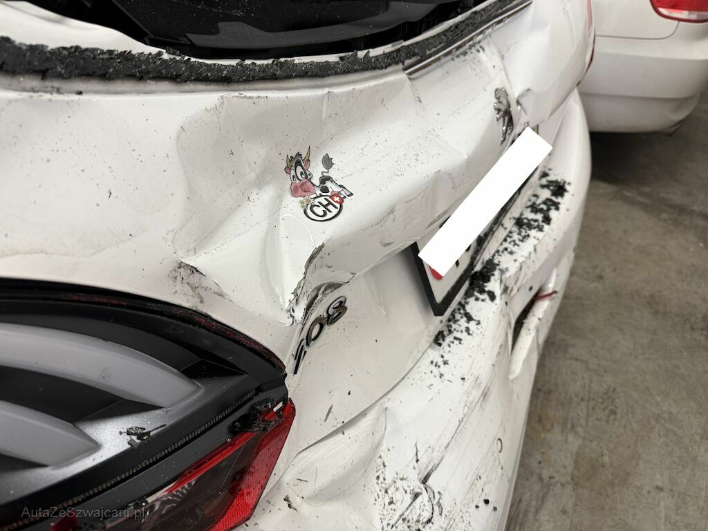Heckschaden: Heck nach vorne verschoben ( Türspalt hinten links). Grossflächig eingedrücktes Heck durch massiven Aufprall.