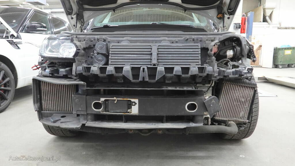 Stossstangenabdeckung und Scheinwerfer vorne links gerissen. Unter der demontierten Stossstangenabdeckung kann festgestellt werden, das auch der Schlossträger verformt und der Ladeluftkühler im Anstossbereich beschädigt wurde.