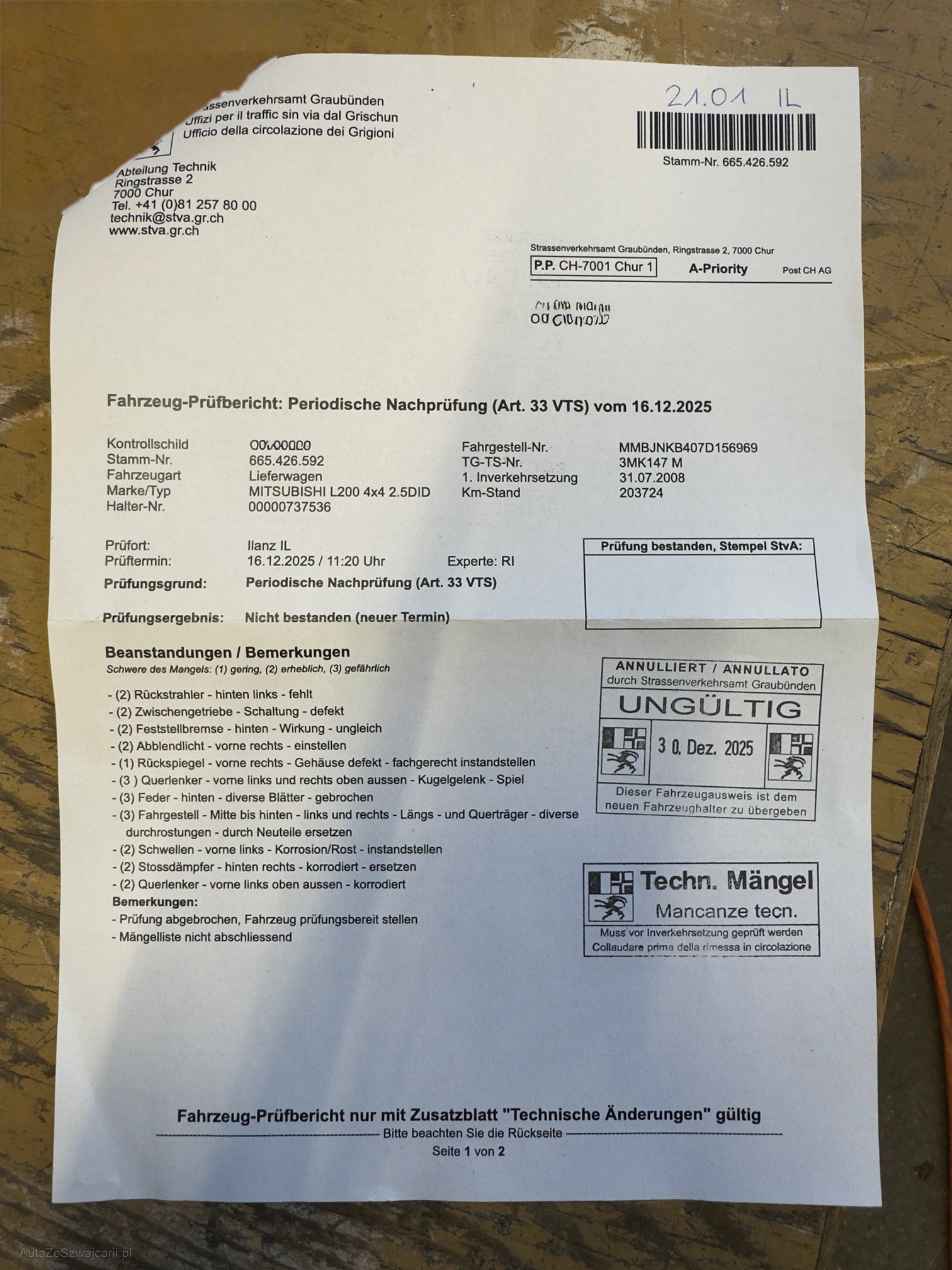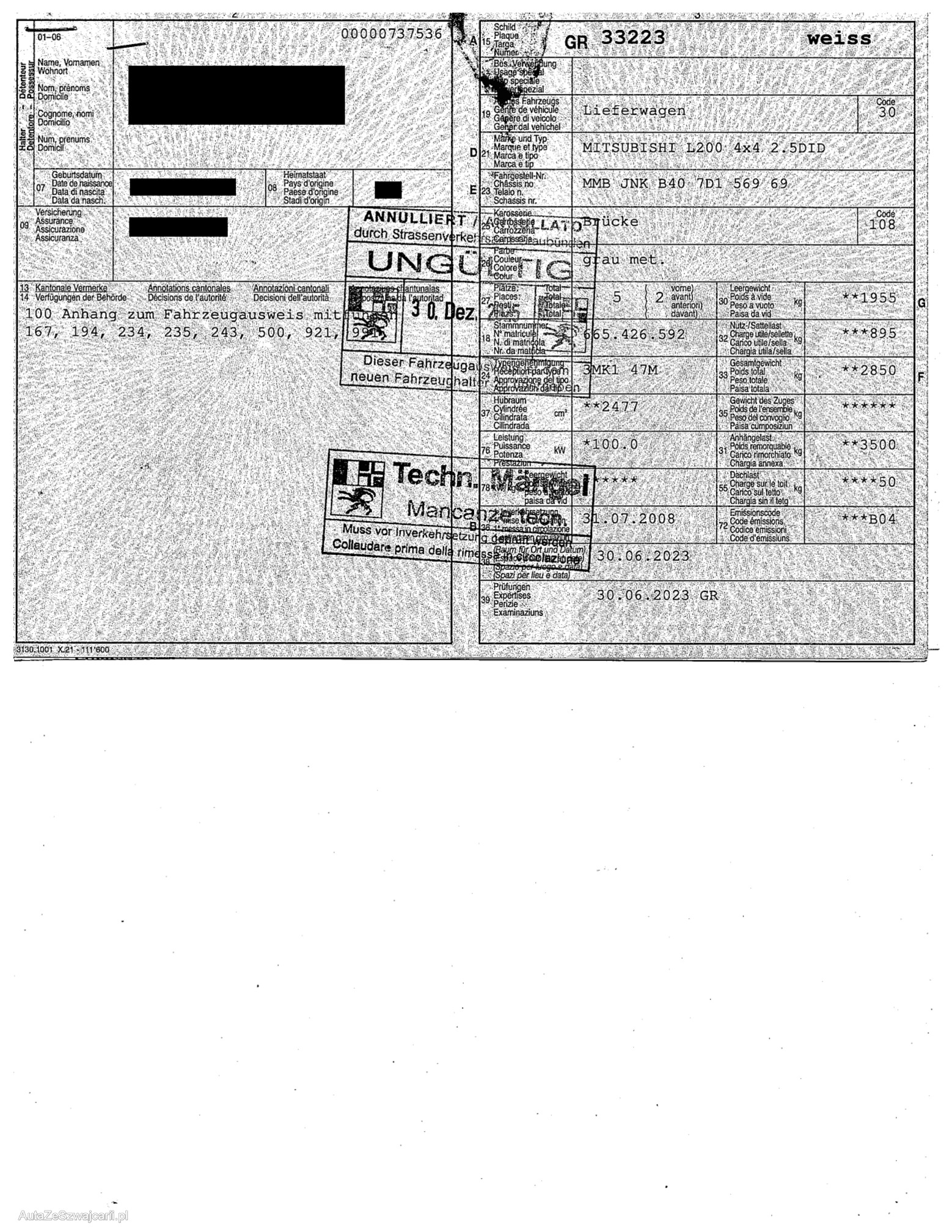 | Kommentar | Letze Service: 05.07.2023 185'310km Letze MFK: 30.06.2023 Fahrzeug hat diverse Mängels (siehe Bilder) Zwischengetriebe Schaltung blockiert Motor und Schaltgetriebe lauft einwandfrei |