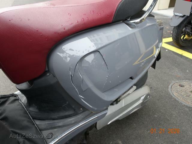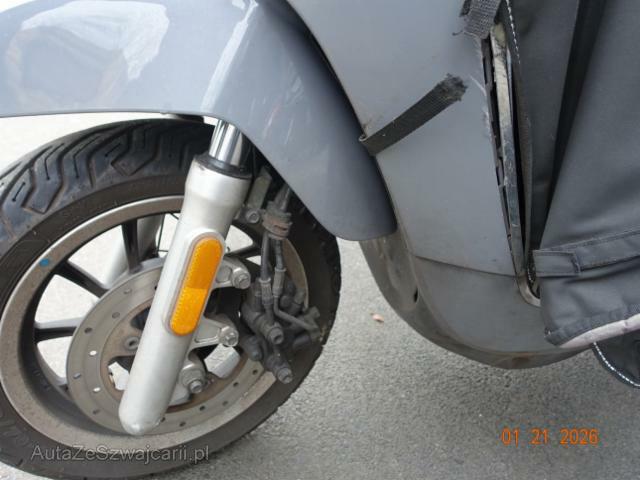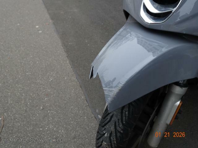 | Condition_and_Equipment | Zustand Fahrzeug muss transportiert werden (Höhe und Breite beachten). Fahrzeug ist NICHT fahrbar. Zweirad-Kategorie Roller --- Links Linke Seite beschädigt. Ist auf die linke Seite gefallen. Verschalung unten links verkratzt. Verschalung hinten links gebrochen. Front Schutzblech vorne defekt. Gabel beschädigt. Glas Windschutzscheibe ist gerissen. |