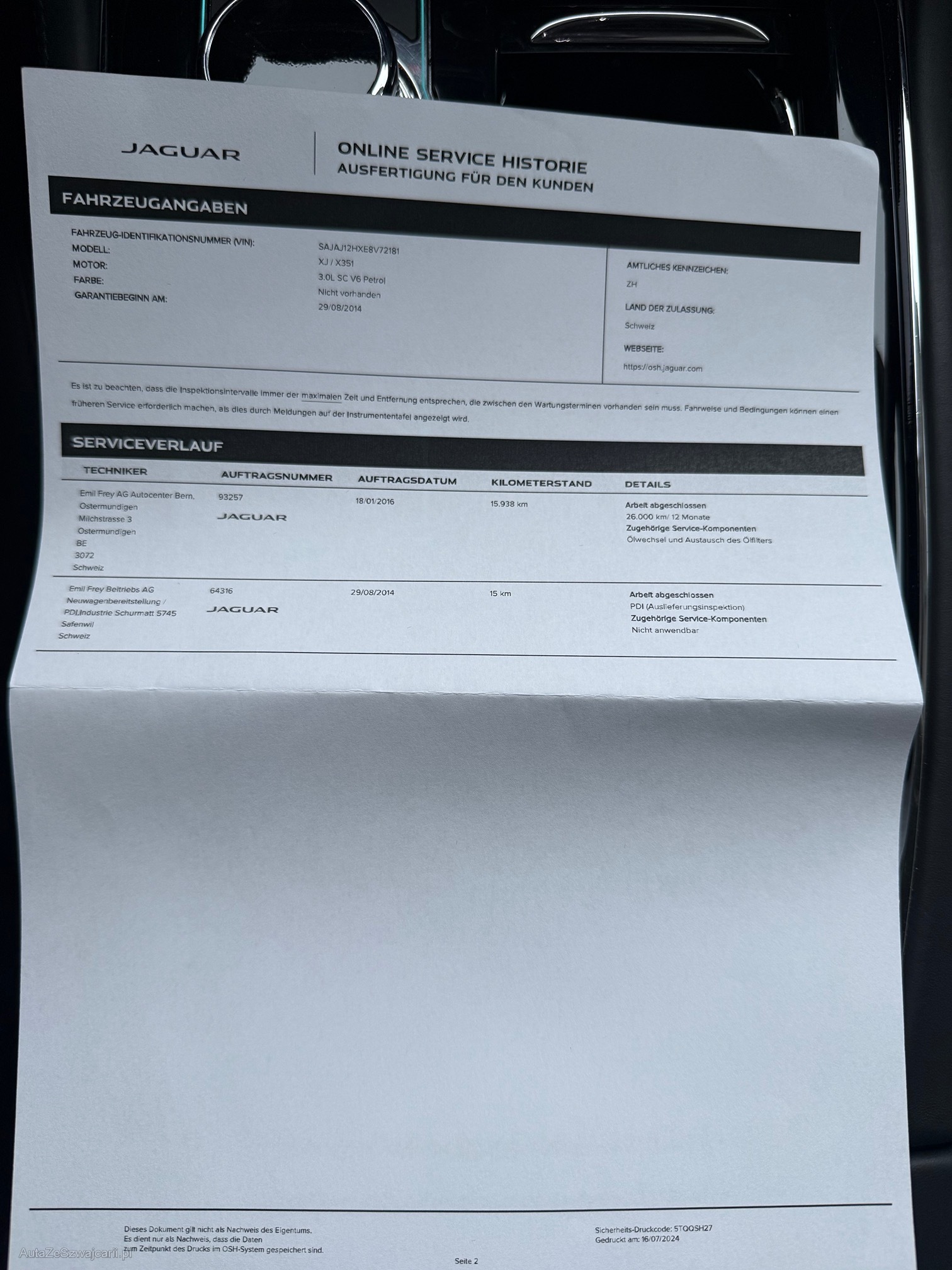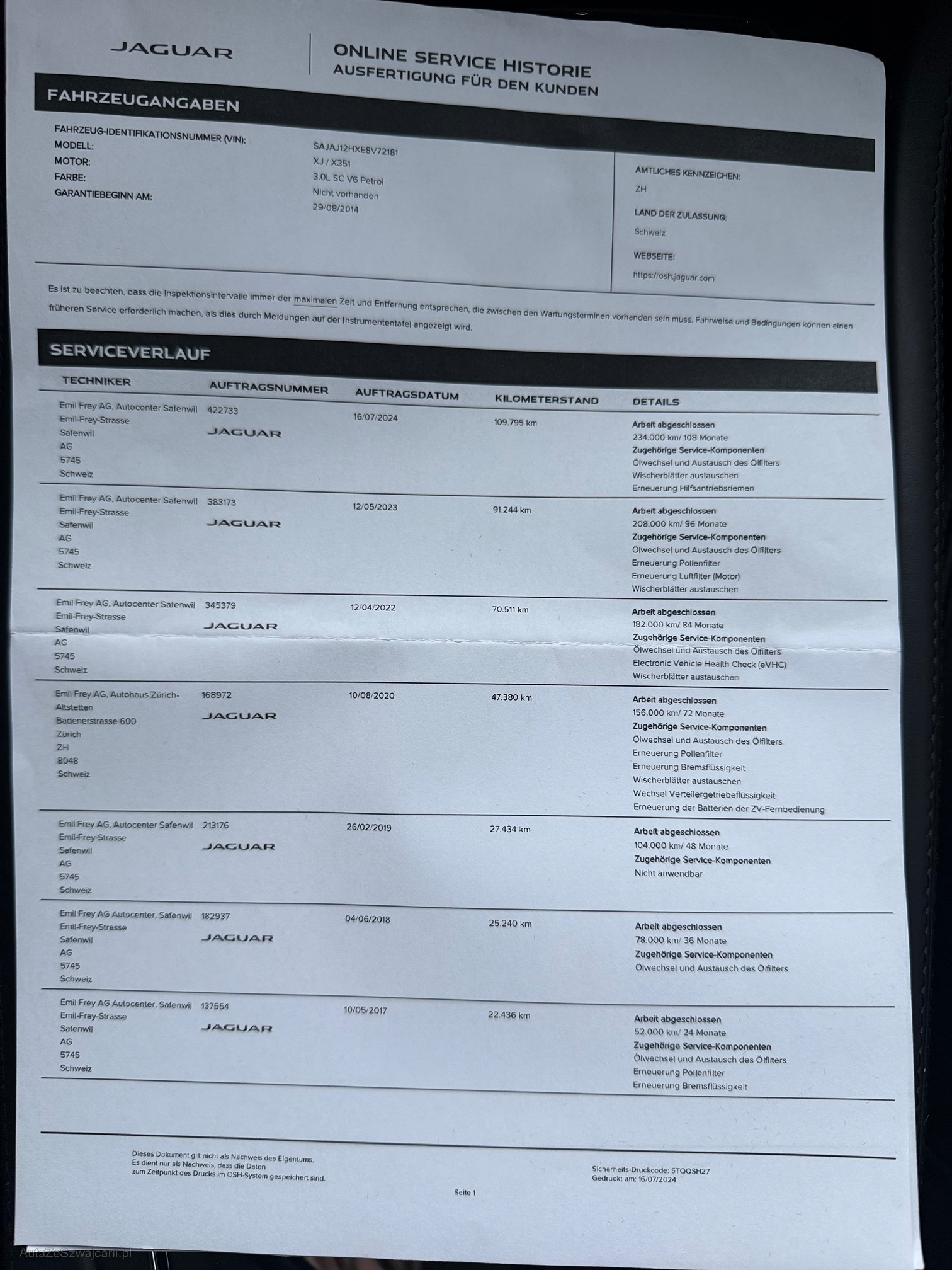 | Kommentar | Servicegepflegt bei Jaguar! Kratzer unterhalb der Stosstange vorne (kaum sichtbar) und an allen Felgen. Reifen sind etwas alt. Service fällig + auf einer Seite funktioniert das Xenon nicht (defekt?). Teilweise sind Knöpfe im Innenraum leicht klebrig. Das Fahrzeug wurde bereits gereinigt und poliert. Top Ausstattung wie: Meridian Soundanlage / Soft-Close / Schiebedach / Abstandsregler / Totwinkel-, Notbrems- und Spurhalteassistent / Digitaltacho / EL. Sitzverstellung mit Memory (Fahrer) und Massagefunktion / Sitzheizung und Lüftung V+H / Lenkradheizung / Licht- und Fernlichtautomatik / Parksensoren vorn und hinten + Rückfahrkamera / 3-Zonen-Klimaanlage u.v.m. Verfügbar ab sofort! Verkauf ab Platz. Es wurde kein Werkstatt-Test durchgeführt. Gebotsabgabe auf eigenes Risiko. Keine Nachverhandlungen auch bei eventuell weiteren Mängeln! Muss im Falle einer Zusage innert 4 Werktagen bar bezahlt und abgeholt werden, ansonsten entstehen Standkosten von 30.-/Tag. |