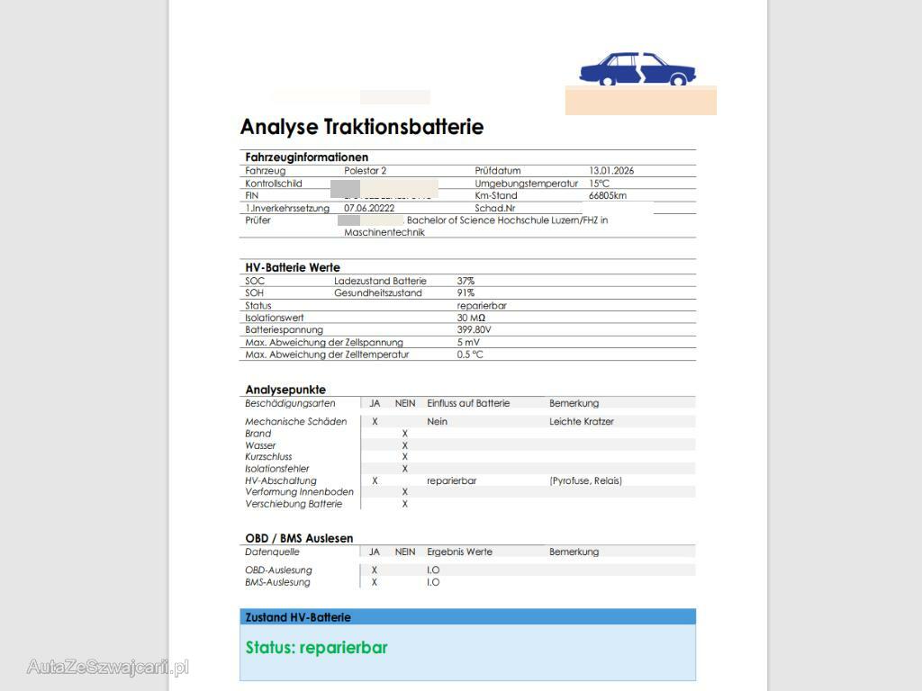 | Zusatzinformationen | Die Hochvoltbatterie wurde geprüft und ist reparierbar. Das Fahrzeug wird mit der HV-Batterie verkauft. Die HV-Batterie muss durch einen Fachbetrieb zurückgesetzt werden, gegebenenfalls Pyrofuse ersetzet werden. Der Kilometerstand wurde geschätzt Die (vom Fahrzeugexperten) ermittelten Reparaturkosten beziehen sich auf das versicherte Ereignis. Allfällige zusätzliche, nicht versicherte Schäden/Vorschäden, sind in den Reparaturkosten nicht enthalten. Die deklarierten Ausstattungsmerkmale können von der effektiven Ausstattung abweichen.AchtungBei einem Hochvoltsystem - Spannungsfreiheit prüfen. Sicherheitshinweise und Betriebsanleitungen des Herstellers konsultieren und befolgen. |
