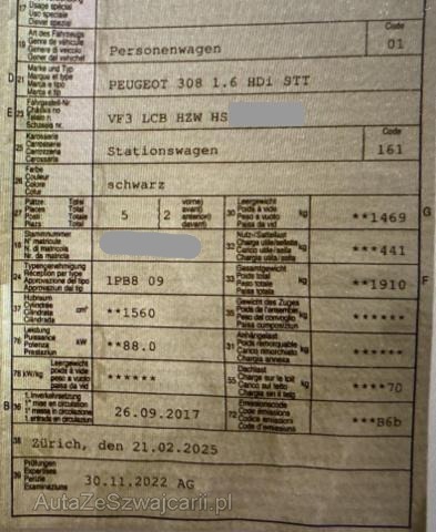 | Condition_and_Equipment | Zustand Fahrzeug muss transportiert werden (Höhe und Breite beachten). Fahrzeug ist NICHT rollbar. Motor startet nicht, Ursache unbekannt. Schlüssel Keine Schlüssel vorhanden. Weitere wichtige Hinweise Schlüssel ist abgebrochen und steckt im Zündschloss. --- Links Tür vorne links ist eingedrückt. Front Front eingedrückt. Kotflügel vorne rechts und links eingedrückt. Motorhaube eingedrückt. Frontblech/Maskenblech eingedrückt. Motor Alle Kühler vorne sind eingedrückt. Achse Vorderachse ist beschädigt. Aufhängungsteile vorne links beschädigt. Lenkgetriebe ist beschädigt. Weitere Beschädigungen -Das Getriebe ist beschädigt. -Die Motoraufhängung ist gebrochen. --- Serienaustattung Airbag Fahrer und Beifahrerseite CD-Player Sitzheizung vorne Elektrische Fensterheber vorne + hinten Aussenspiegel elektrisch verstellbar und heizbar Servolenkung Seitenairbag Fahrer und Beifahrerseite Zentralverriegelung mit Fernbedienung Höhenverstellbare Vordersitze Lederlenkrad Lenkrad verstellbar Kopfairbag vorne und hinten Leichtmetallfelgen 16" Deaktivierung Beifahrerairbag ESP/ ASR Lendenwirbelstütze Fahrersitz Rücksitze geteilt umklappbar Gepäckrückhaltenetz ABS und EBV Elektr. Bremskraftverteilung inkl. BA Pack Visibilité Zwei Zonen-Klimaautomatik Mittelarmlehne vorne mit Staufach Dieselpartikelfilter Kindersitzverankerung ISOFIX hinten Head-Up Display Reifendruck-Sensoren RDS Berganfahrhilfe Einparkhilfe hinten Touchscreen-Bildschirm Stop + Start System USB-Anschluss Bluetooth Freisprecheinrichtung Geschwindigkeitsregler und - begrenzer programmierbar Keine Gewähr auf die Angaben der Serienausstattungen Apple Car Play/ Android Auto Navigationssystem/ Peugeot Connect Garantie 3 Jahre/ 80'000 km Sonderausstattung Metallic-Lackierung |