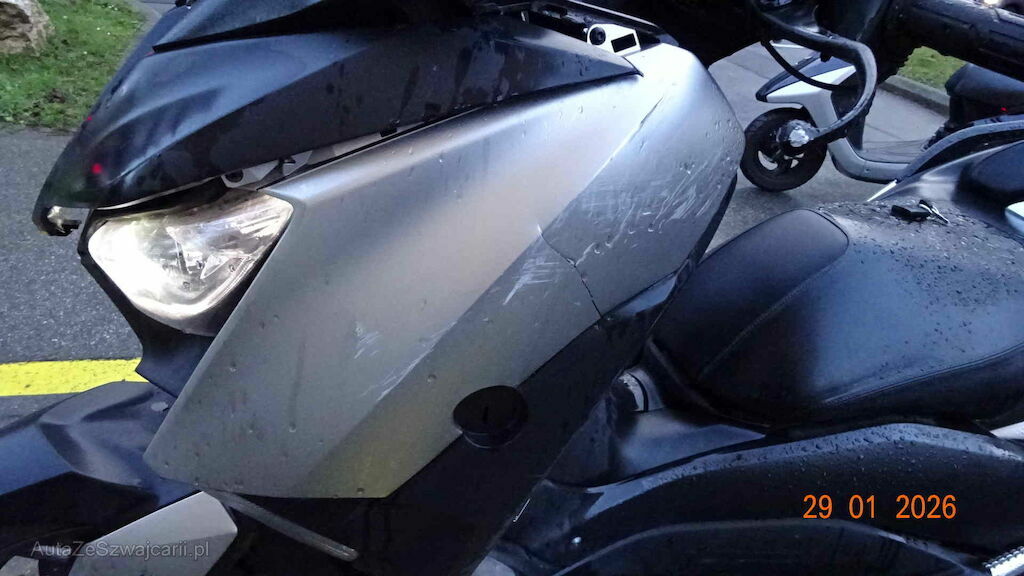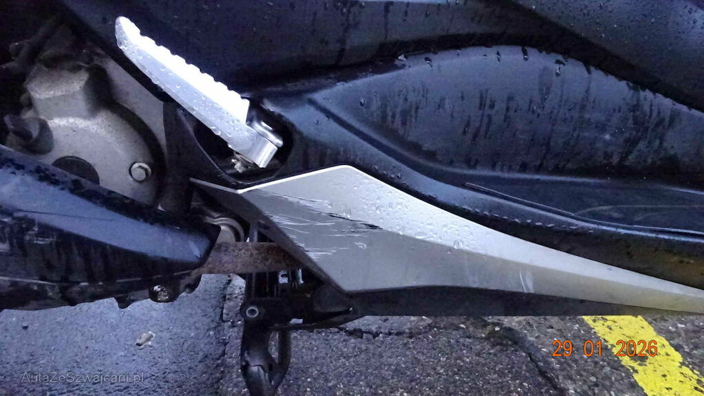 Choc arrière droite et chute côté - Carenage arrière, échappement et bas de caisse à droite, phare, cache phare, retro, levier frein, embout, carenage, latérale, bas de caisse, carenage arrière, filtre à air et top caisse côté gauche