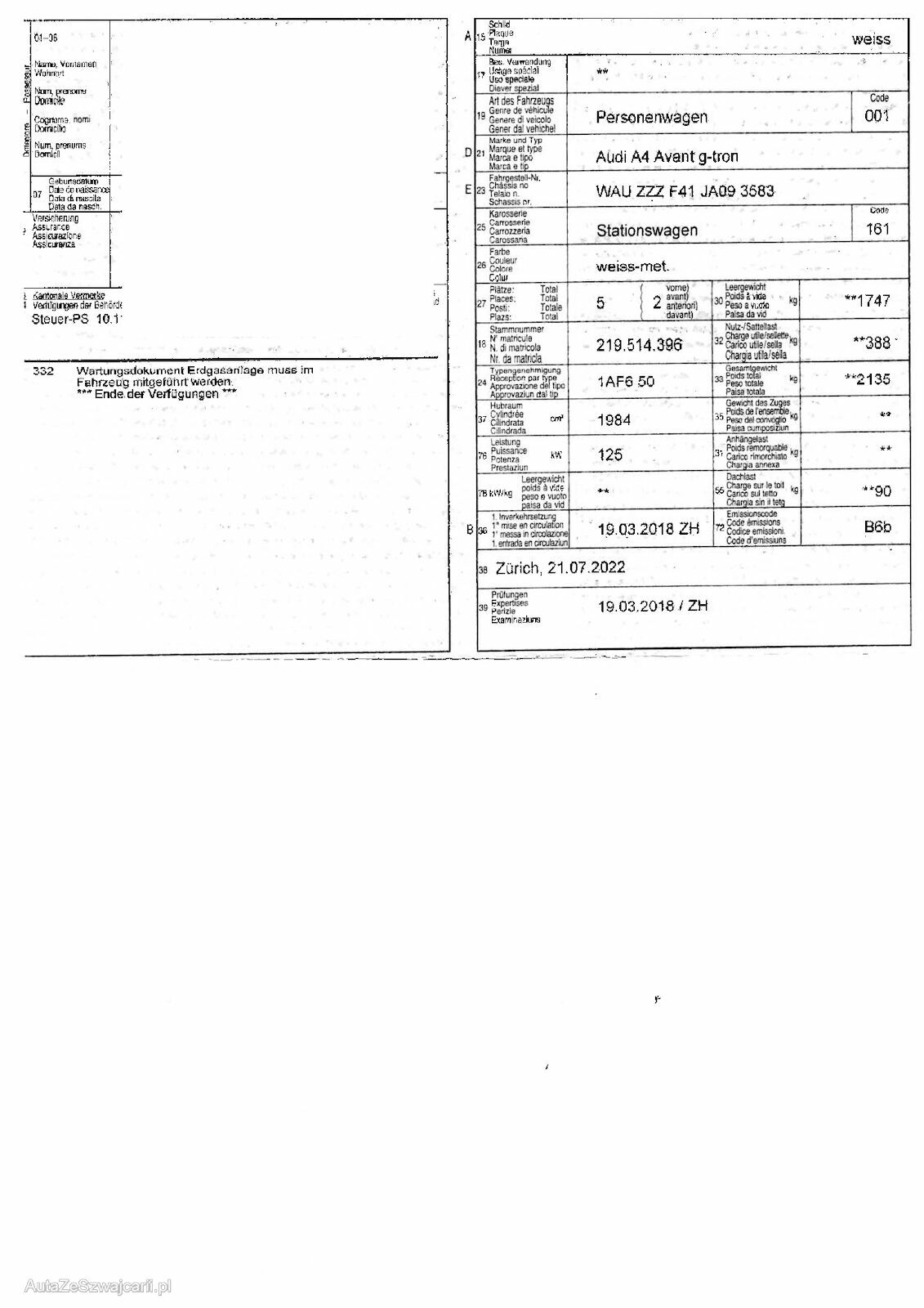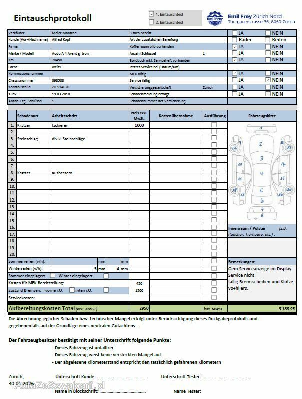| Information | Keine technische Prüfung (Werkstatttest) vorgenommen Diverse Schäden an Karosserie/Lack. Fahrzeug ab Platz, ohne Garantie und Aufbereitung. DPF/FAP Filter nicht kontrolliert Keine Gewähr auf die Angaben der Sonder- und Serienausstattung / keine mechanische Prüfung. Fahrzeug wurde unzerlegt expertisiert / keine Haftung für allfällige, nach Demontage bekanntwerdenden Mängel. Fahrzeugbereifung und Ausstattung gemäss Fotos / Fahrzeugkauf auf eigenes Risiko ab Platz ohne Nachwährschaft. - Div. Steinschläge - Div. Kratzer |