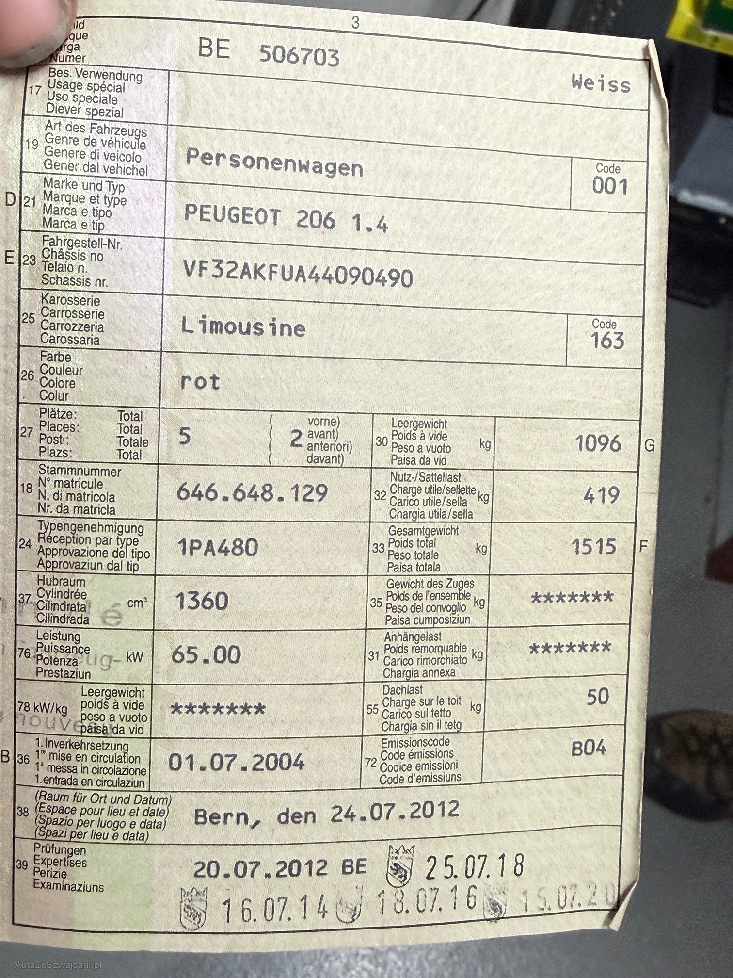 | Kommentar | Zum Verkauf steht ein Peugeot 206. Die Startbatterie ist leer, das Fahrzeug muss mit einem Booster bzw. per Starthilfe gestartet werden. Ansonsten fährt sich das Auto gut. Es wurde kein Werkstatttest durchgeführt. Verkauf erfolgt ab Platz, wie auf den Fotos ersichtlich, ohne Garantie und ohne Gewährleistung. Karosserieschäden gemäss Fotos vorhanden. |